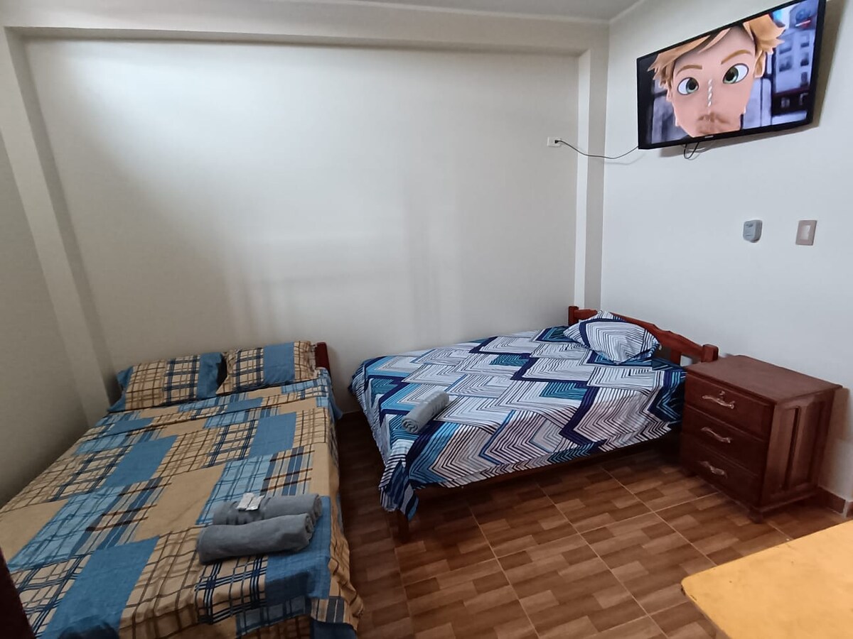 1.DEPARTAMENTO PRIVADO y con acceso directo, segundo piso, Aire Acondicionado, WI-Fi de alta velocidad y vista a la calle. Ubicada a 12 cuadras de la Plaza de Armas. 2 habitaciones: Una matrimonial con cama Quee, más colchón de 1.5 en el piso y otra Doble con 2 camas de 1.5 plazas. 1 baño completo, 3 ventiladores de techo, cocina, comedor sala con 2 TV Smart, lavandería privada. Colchón en el piso para un quinto huésped. 2.TERRAZA COMPARTIDA con lavatorio, parrilla a carbón, comedor, baño.