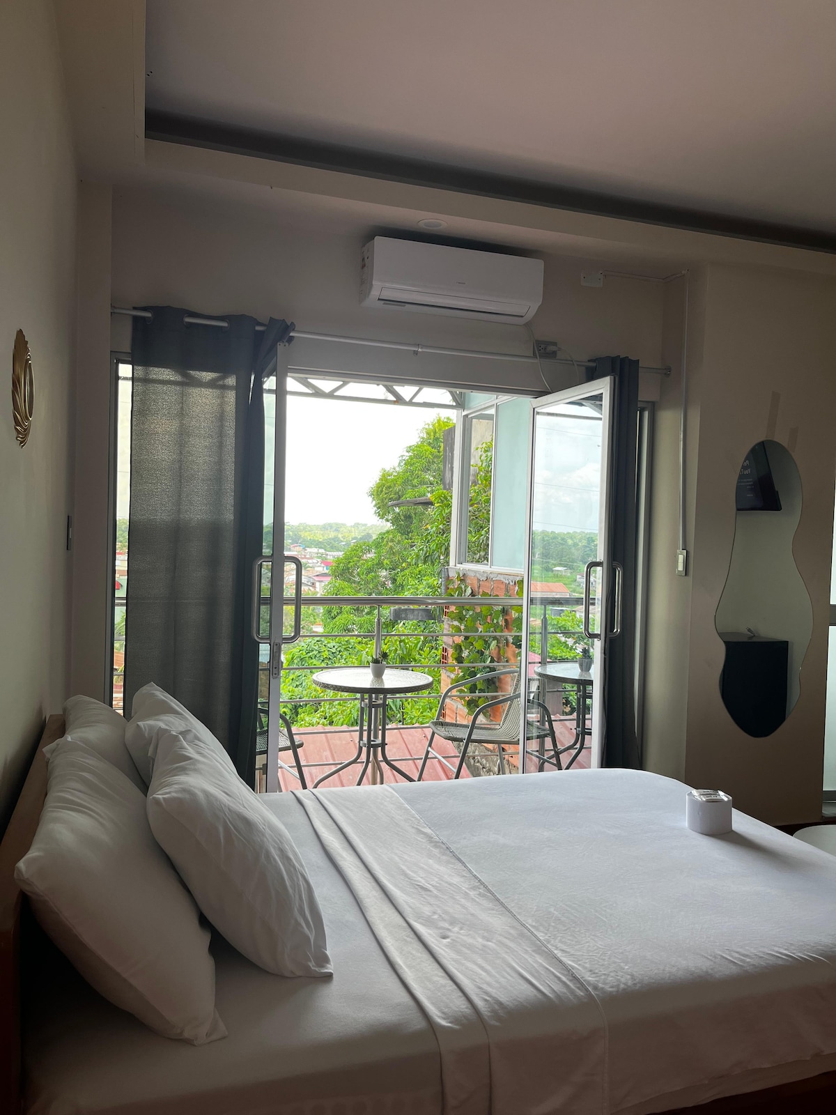 cuarto con cama doble,baño propio ,ventilador,tv smart 55 pulgadas,con ventanas bien ventiladas y vista hermosa a la ciudad,cuartos frescos y limpios