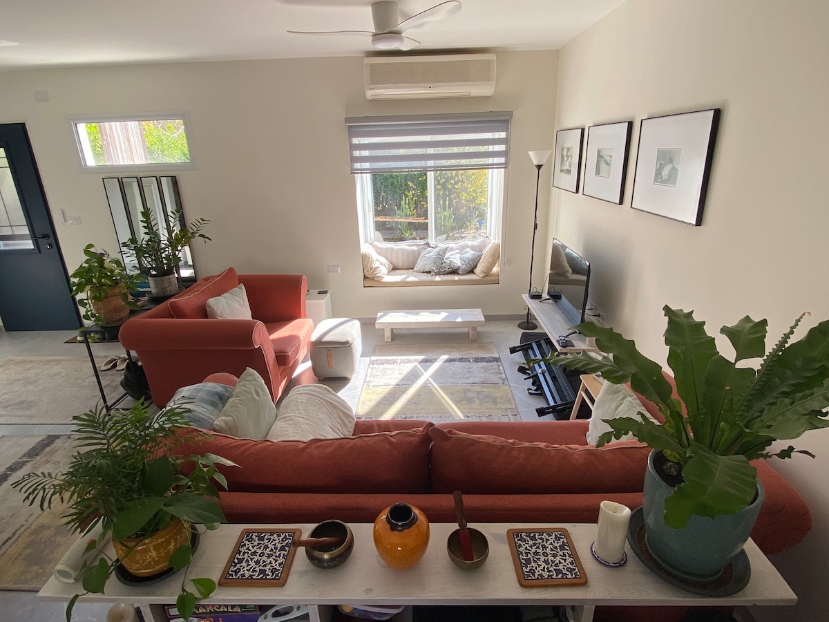 Forget your worries in this spacious and serene space. It is the upper floor of a private house with a private entrance. Very easy access from the street. Plenty of free parking. You will definitely enjoy the balcony off the living room overlooking the Galilee mountains and the northern sea shore. In the living room there is a large, 65”, TV with Netflix, Israeli channels and more. Self check in (at 3:00 pm) and checkout (at 11 am). Please let us know if you will need one or two bedrooms.