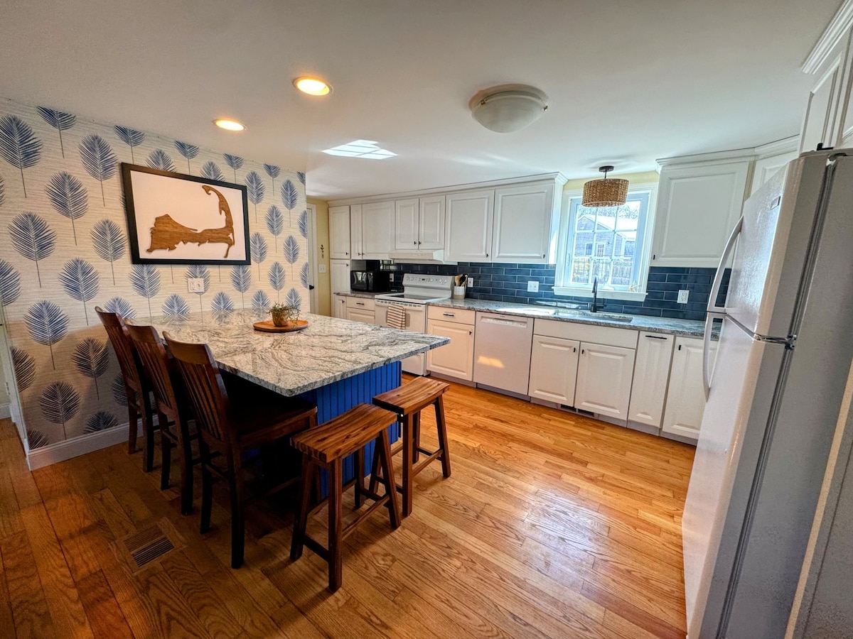 Your perfect Cape Cod escape awaits! Coastal chic home base w/ king bed & AC near all Cape Cod has to offer. <8 min to pristine beaches, endless local shopping, entertainment & dining. Short walk to Wings Grove Beach to fish, kayak or swim in serene Long Pond - perfect for kids! Take in nature while biking the Cape Cod rail trail (4 min away) & ride all the way to the outer cape! BBQ, enjoy the firepit, fenced in yard, and outdoor shower. On cool nights, cozy up next to the indoor gas fireplace.