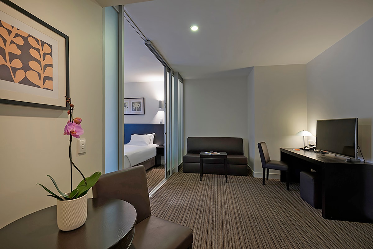 Room on offer is operated by Melbourne Metropole Central Apartment Hotel. Discover your home away from home in Melbourne with our stylish and cosy studio apartment. Perfect for unwinding after a day of exploring the city, our comfortable queen bed and heating/air-conditioning provide ultimate comfort. Our modern furnishings add an extra touch to your stay, combined with free Wi-Fi, Foxtel and in-room dining Images are indicative only - room availability is subject to change as we are a hotel