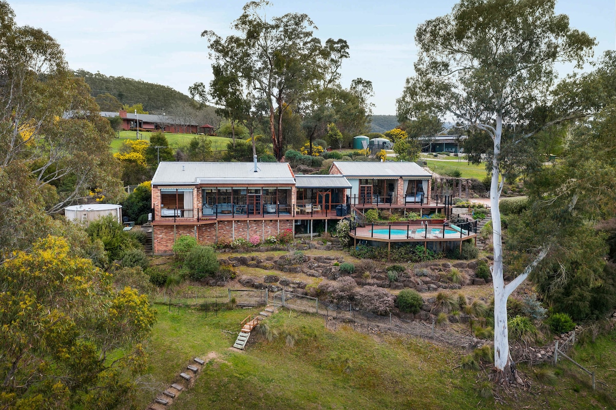 Kangaroo Manor is a luxurious 40 acre private paradise, offering you a truly unique Australian Experience. From the moment you drive up the magnificent drive, this architecturally designed, hexagonal glass house takes in the breathtaking views. High ceilings, glass walls, very private, huge amazing pool, we have a river walk on the property and it's close to wineries and all the Yarra Valley has to offer. Only an hour from Melbourne CBD.