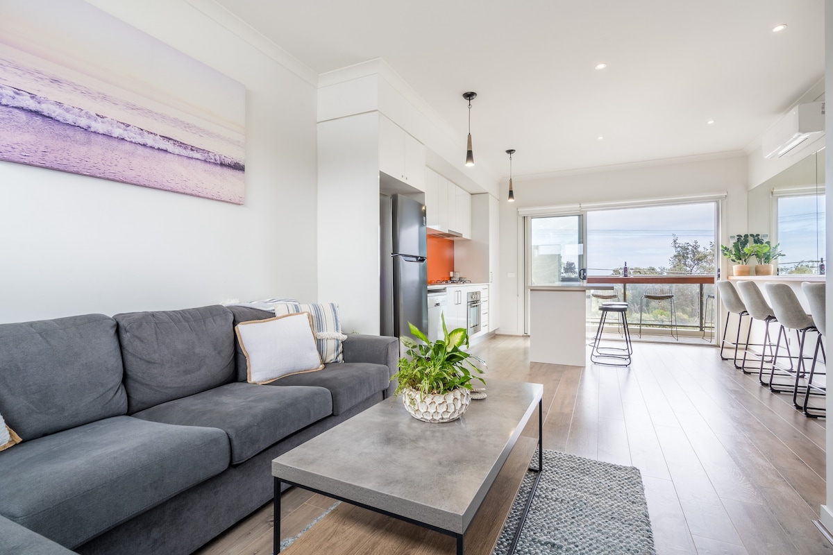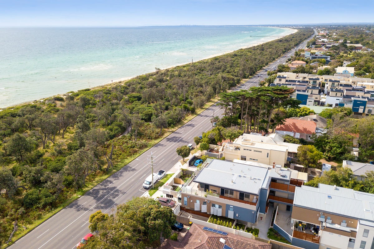 Light, bright, ocean facing apartment on first floor. Beach across the road; station 15 min walk, 45 minutes drive into the city. Close proximity to mornington peninsula. Shopping strip with trendy cafes, a weekend market and pier within close walking distance (1 km). Wi fi, all comfort amenities. Flowing Creek running through back garden, ideal for kayaking. Stan, Netflix, Disney and Chanel nine news streaming on tv in lounge area and bedroom as building has tv reception issues.long lease avail