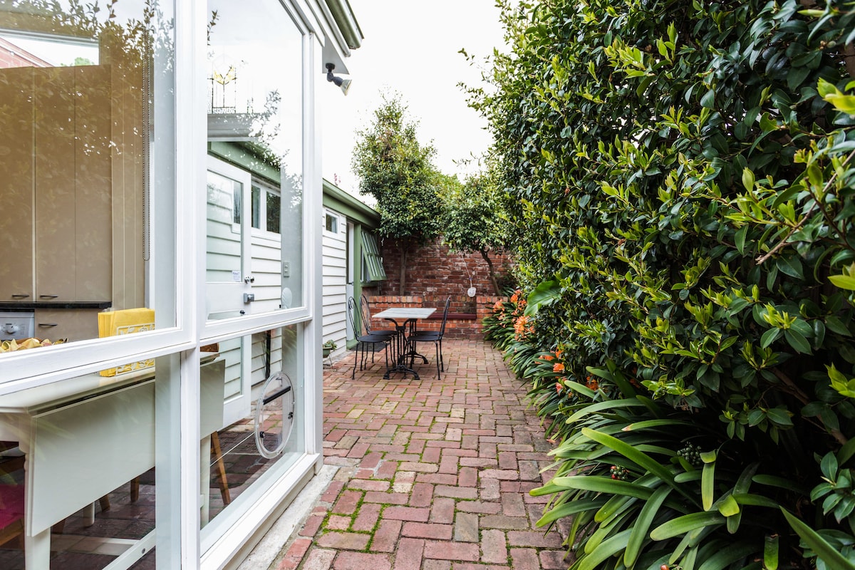 Experience the perfect blend of history and comfort in this Edwardian cottage. Discover a welcoming retreat with a mid-century modern aesthetic, bright living areas, original lead pane stained-glass windows, and a private outdoor dining space. The two main bedrooms with queen-sized beds are quiet and spacious with air-conditioning and heating units. The third bedroom is very comfortable for one person and is accessed via the courtyard by going outside.