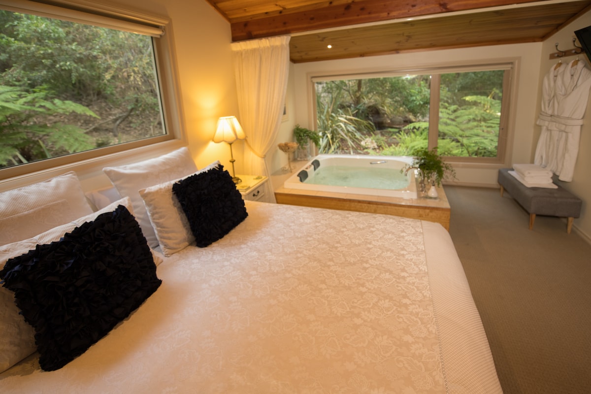 Relax and unwind in utmost seclusion in one of our three romantic beautifully appointed self-contained cottages, nestled in amongst the giant tree ferns and eucalypts in your very own secret rainforest hideaway. Lie back and enjoy a sensual double spa together, as you gaze out through tremendous picture windows into the forest, while your log fire crackles away gently in your sitting room. You’ll sleep soundly in your sumptuous king-size bed and wake to another world, surrounded by 15 acres.