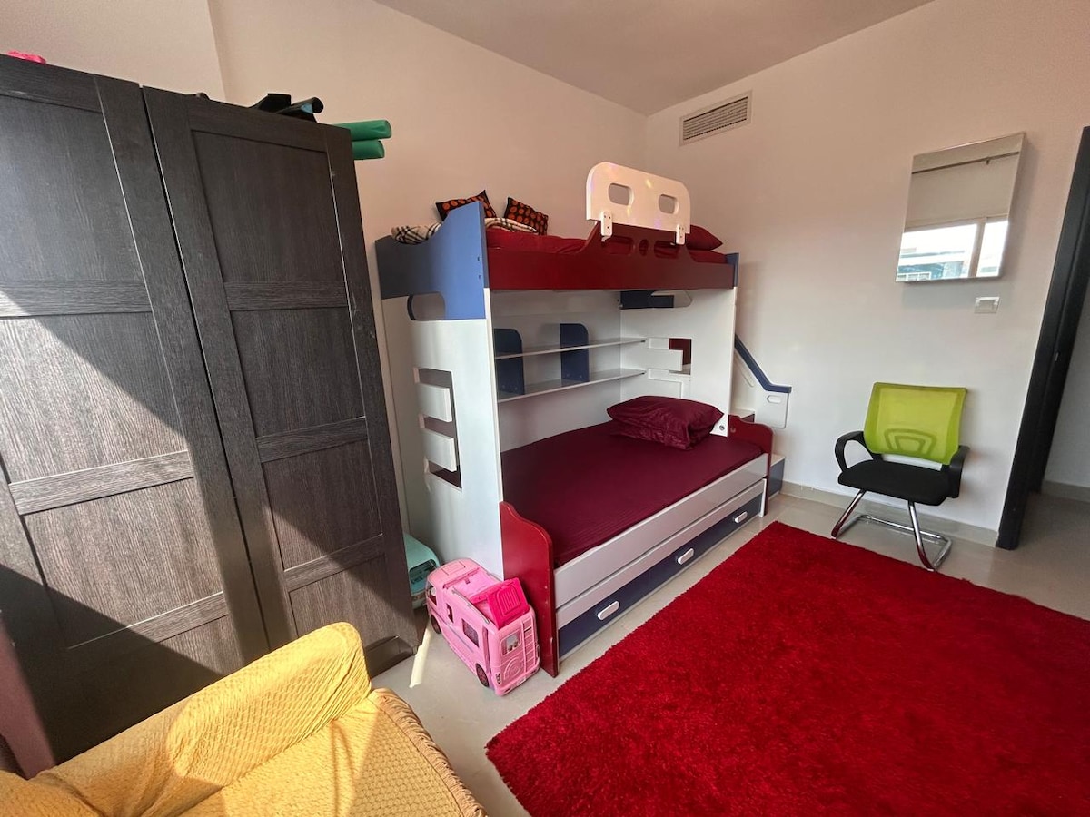 Relax with the whole family at this peaceful place to stay. It is 10 minutes distance from Ferrari world and Yas Marina Circuit. We have capacity for bed for 6 adults. Plus we will provide dedicated parking slot as well for our guest. Airport pick up and drop off facility we can arrange with additional cost. Come and enjoy your stay and we will be glad to host you at our place. All furnitures and kitchen accessories are brand new for our guest.