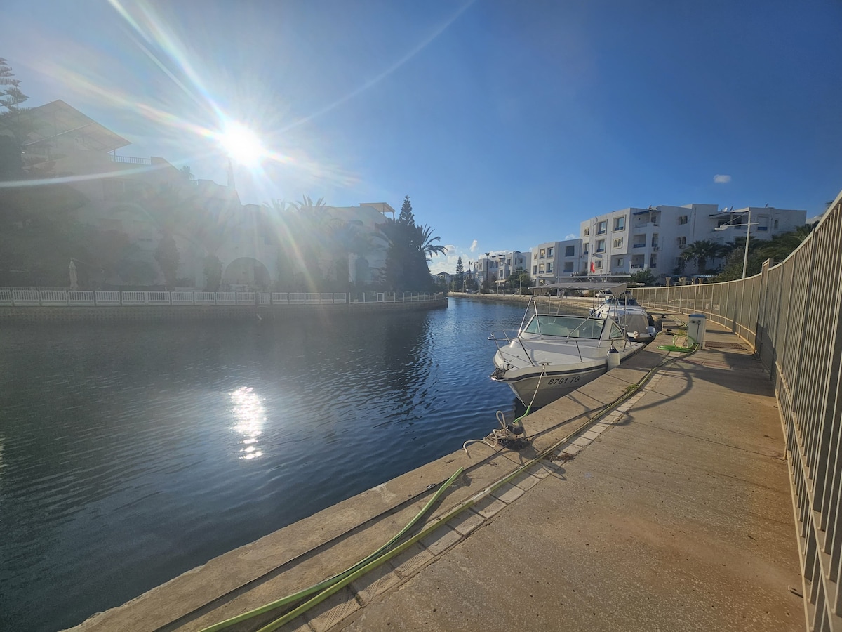 Appart luxueux entièrement meublé salon sejour et 3 chambres à coucher Cuisine salle de bain salle d'eau avec place de parking au sous sol, wifi gratuit,climatisation Split TV , piscine pour adultes et piscine pour enfants. Emplacement strategique au coeur de la station balneaire yasmine hammamet,plage et marina, port de plaisance, carthage land et la medina avec ses resto , bars, salons de thé branchés,discothèques et cinema. Plage turquoise à 5mn à pied et balade en mer.Jusqu'a 8 personnes.