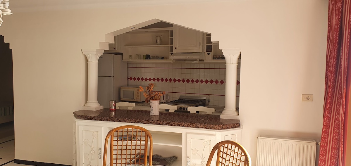 Ce logement paisible offre un séjour détente pour toute la famille. Sa localisation à cité El Wafa Mrezga Hammamet Nord lui met en avant pour sa proximité de la plage sidi Mahersi 5 min à pied et de sa proximité de toutes les commodités (fast food tunisiens, restaurant, Anouar Market, coffee shop, etc). L’appartement est équipé de 2 télés, 2climatiseurs, four, lave linge, sèche-linge, cafetière, batterie de cuisine pour faire des plats etc avec accès piscine partagé et parking voiture gratuit.