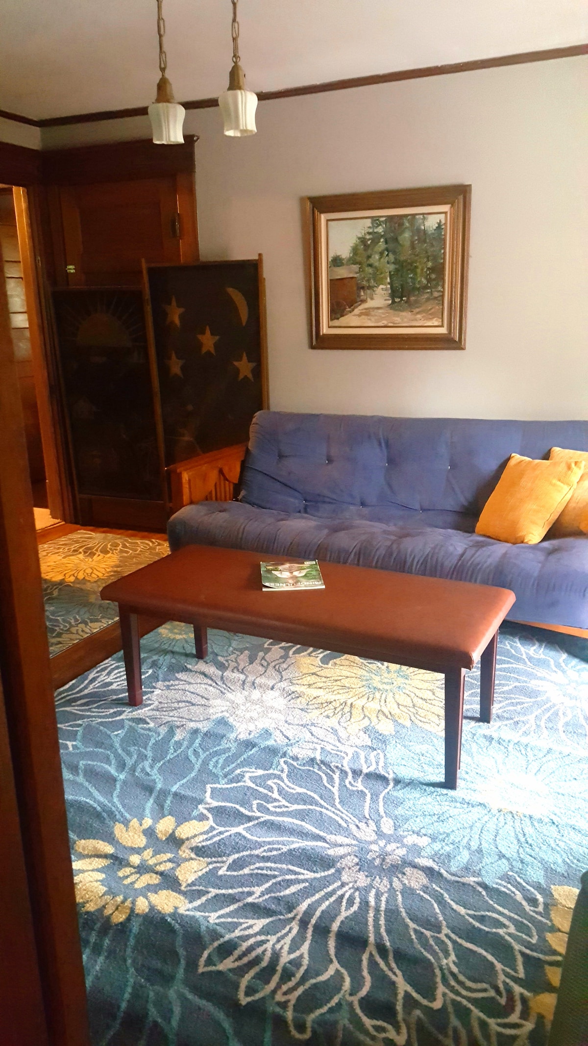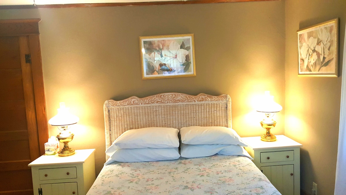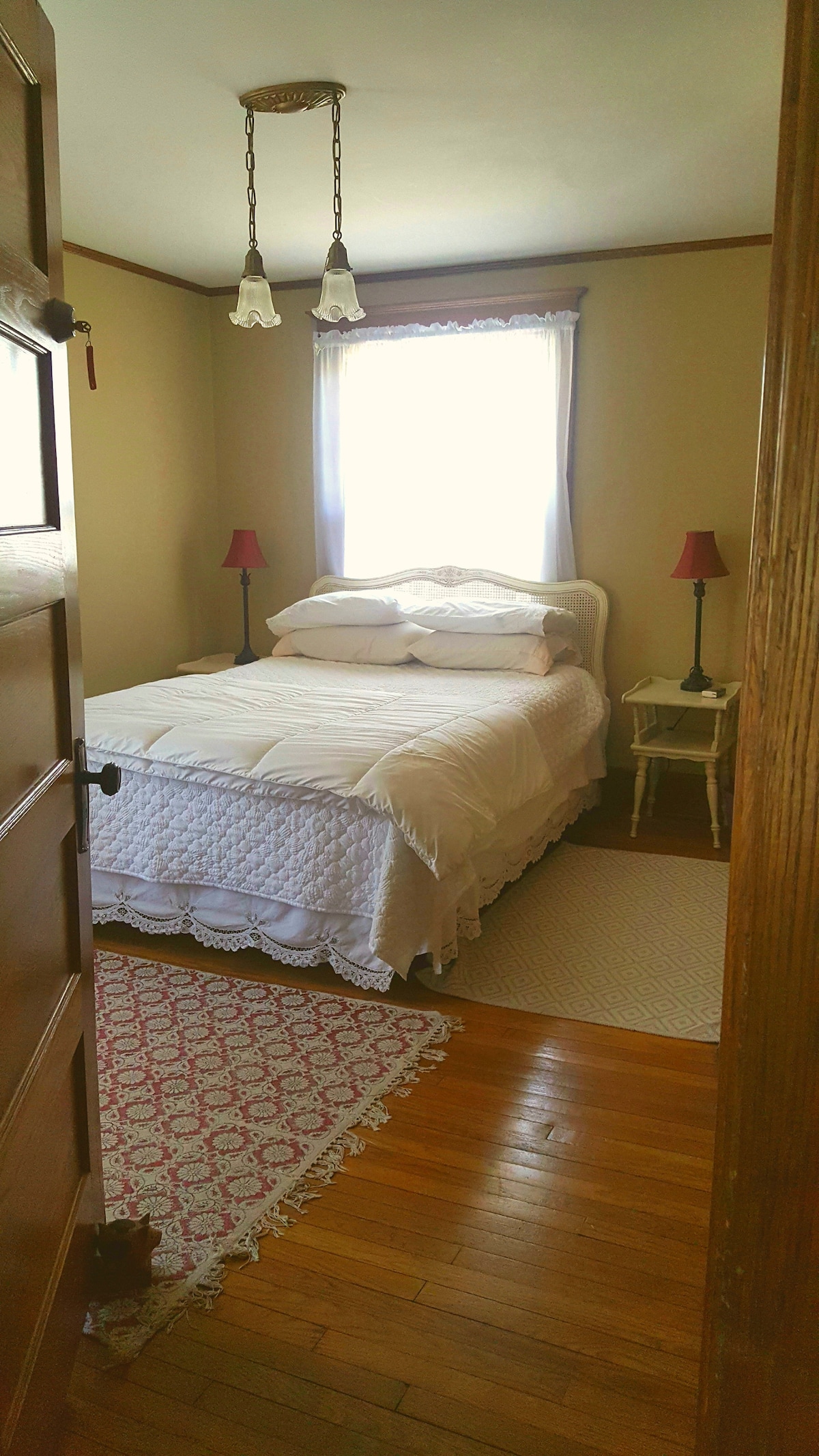 Enter this sweet, romantic first floor bedroom through lovely French Doors. Hide away to a romantic spot to relax on a Queen-sized bed made up with crisp, country-fresh linens surrounded by the stained glass alcove,that will give you the feel of the 1920’s era. You will have access to the front Veranda where you will take in garden views as well as morning sunrises over lovely Seneca Lake. There is a heated bath with a shower for two, and separate “toilette” room. A cozy table sitting with two chairs is a perfect “morning coffee” spot. Enjoy two other relaxing chairs with lamp to read or watch TV. A mirrored armoire, has drawers and hanging spaces.