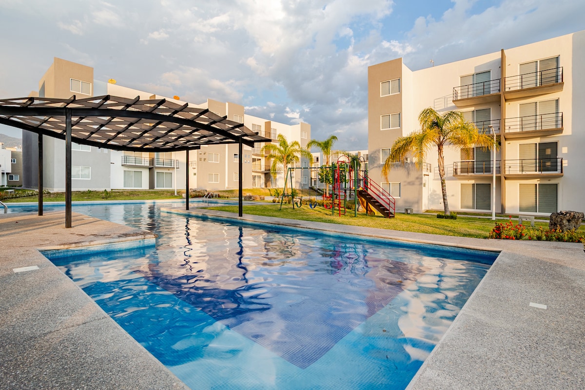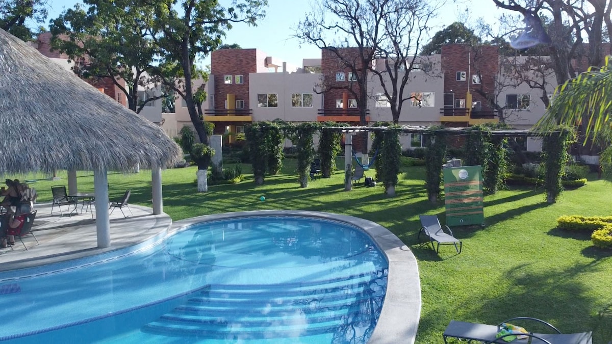 Disfruta de este alojamiento tranquilo y céntrico. Cuenta con todo lo necesario para relajarse un fin de semana, 2 estacionamientos dentro del residencial, aire acondicionado, sillas y mesas para jardin, asador, juego de canasta de basquetball, WiFi de alta velocidad, alberca muy amplia y cuenta con seguridad las 24 hrs., pasa un fin de semana con un clima agradable todo el año.