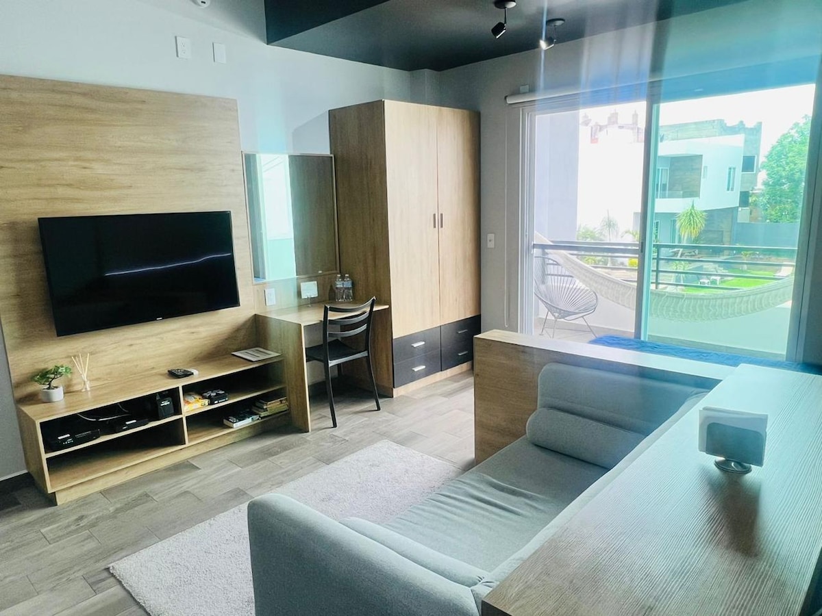 Disfruta de un estudio/Loft/depto de lujo, con 40m2 de espacio, ideal para descanso/Home Office, con todo lo necesario para relajarte y disfrutar de los espacios y areas comunes ( albercas climatizadas, jacuzzis, asador, terraza, roof, estacionamiento, guardias de seguridad 24/7, gimnasio y más) Contamos con ecofiltro para agua purificada, cafetera, sartenes, estufa, refrigerador de 11 pies, platos, vasos, tazas, horno de Microondas, TV smart de 50", ventiladores en techo, enfriador de aire