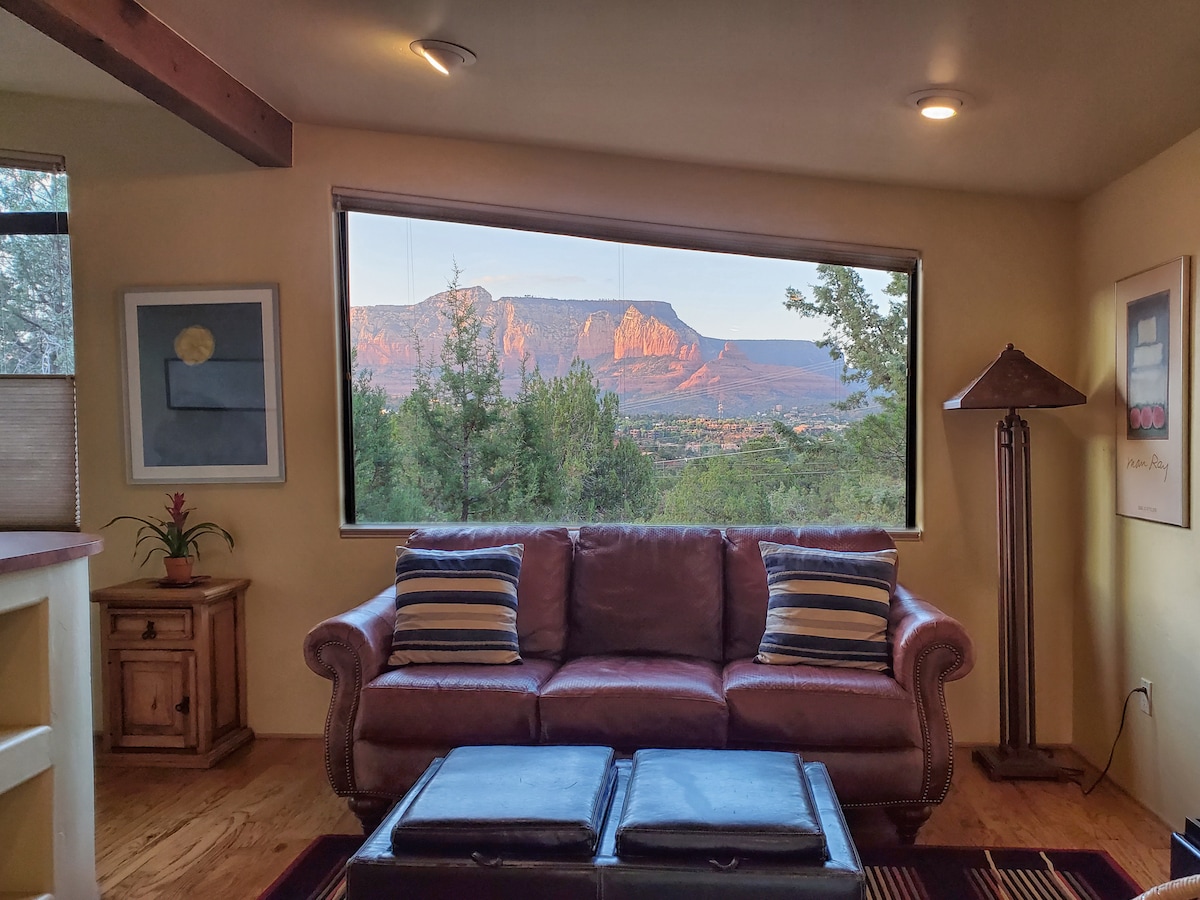 Guest home in Perfect West Sedona location! 580 sq ft of quiet serenity. Close to hiking, restaurants, spas, stores+ away from traffic! Light, airy, clean, and inviting. We anticipated your every need. New: Queen Serta mattress, Wifi, DVD, Smart TV/NO Cable, Wash/Dryer, stocked kitchen (2 ceramic hot plates and toaster oven). Bedroom is not separate. Due to allergies, we are unable to host any animals. No smoking. 2 adults or 2 adults/1 kid. Queen sofa bed. Walk to 360° view of Red Rocks.