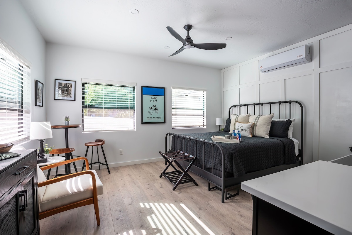 This newly renovated (2025) modern desert studio offers the perfect blend of privacy and comfort. While attached to the main house via double exterior soundproof doors, it has its own separate entrance, ensuring complete privacy and a peaceful retreat. Inside, you’ll find a luxurious king-size bed, creating the ideal space for rest and relaxation. Large windows frame breathtaking views of the surrounding desert, filling the studio with natural light and offering a serene, calming atmosphere.