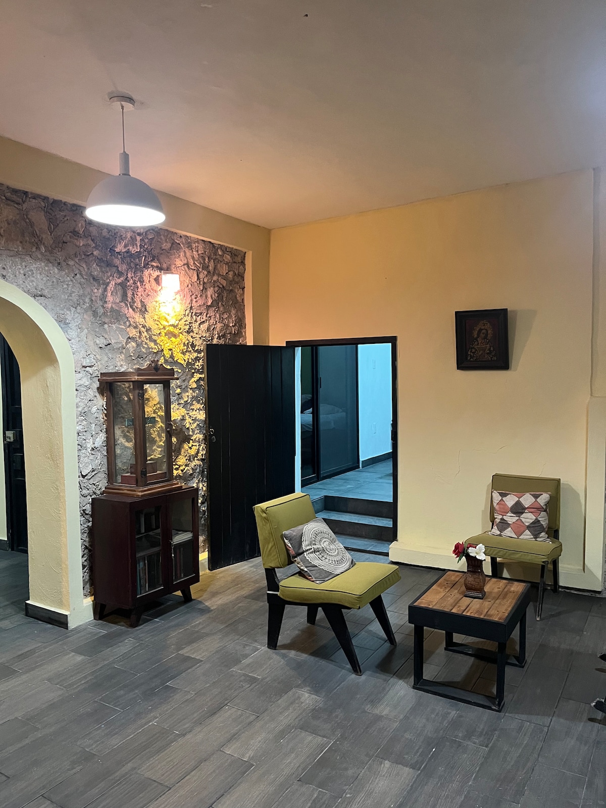Desconecta de tus preocupaciones en este espacio tan amplio y sereno y al mismo tiempo cerca de Chichén Itza y Cenotes. Casa con piscina y espacio de jardín y mesas al aire libre, bar de madera , sala , comedor , cocina con barra desayunadora, 2 baños completos , uno para el área de piscina, cocina, sala y exterior; y uno privado dentro de la habitación. La cocina cuenta con frigobar, sartén eléctrica , estufa eléctrica, TV , cafetera, utensilios para cocinar.
