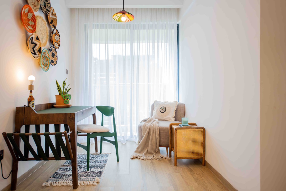 Opting for clean and uncluttered energy, you’ll find this apartment unit equipped for the most discerning guests. The living space displays minimalism with a tone style to complement contemporary decor with a hint of Japanese Wabi Sabi style. Colors are serene and neutral and comfort is the standard. Wall-to-wall glass facade windows flood the space with natural light (and warmth). Looking to take a siesta? Note : Gym and Pool is paid for guests that stay +30 days
