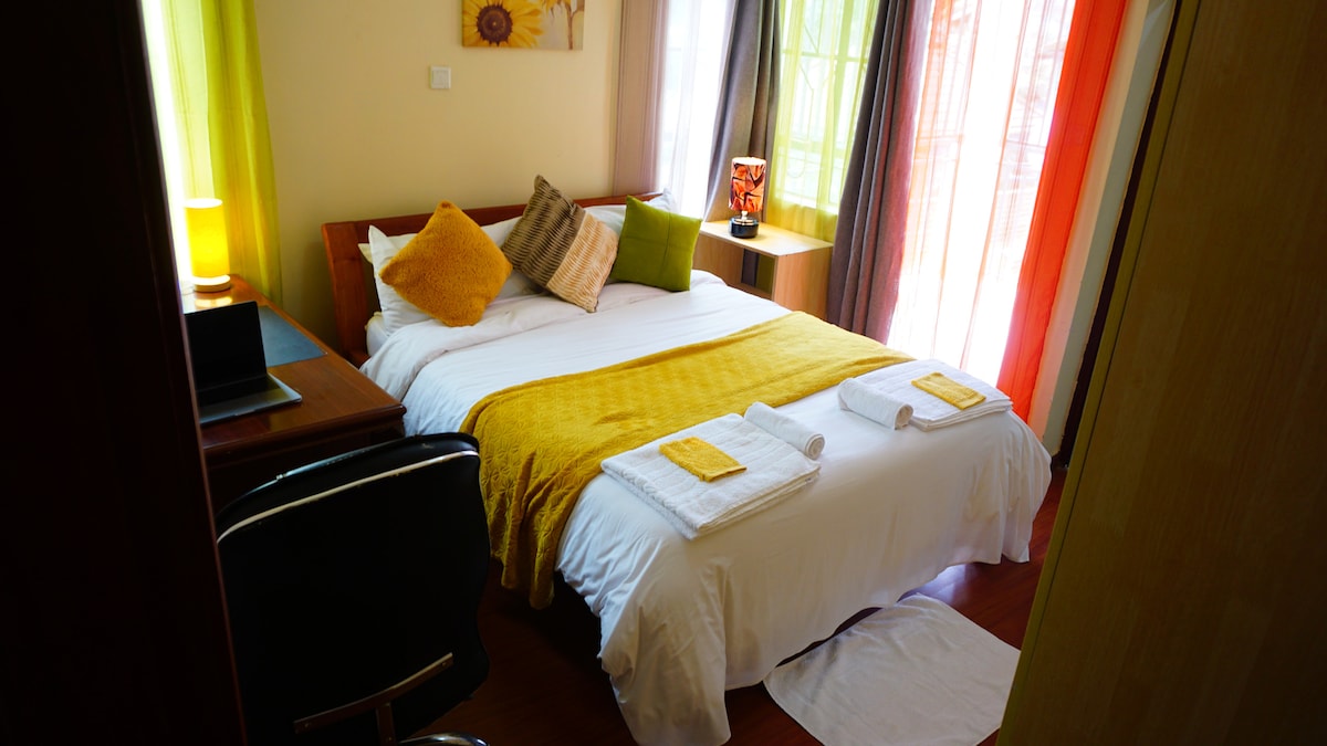This elegant & tastefully-furnished apartment is on the 4th floor, allowing for excellent views of the area. With 24-hour security, the gated community is located in Nairobi's Financial District, has easy access to Downtown, Kenyatta & Nairobi Hospitals, AAR, Nairobi Club, National Library, restaurants, banks, Shopping Malls. It is near the Israel Embassy & Fairview Hotel. Great for business & vacation stays. Our space is disinfected and sanitized.