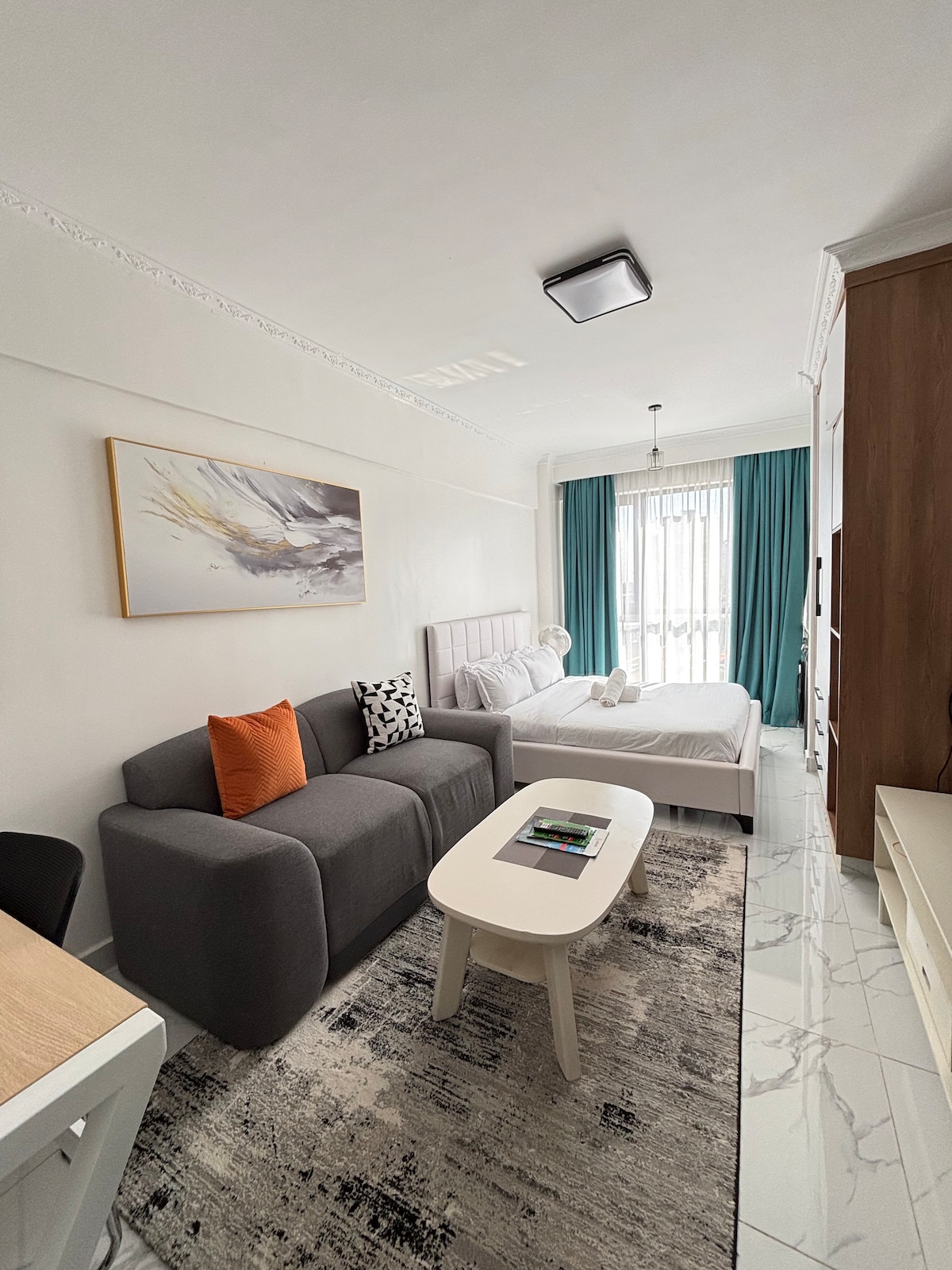 Spacious Bachelor Studio, Queen bed, 4KTV, 5GWIFI, equipped kitchen, weekly cleanings including laundry, patio overlooking kilimani. Unwind with Netflix & Amazon Prime, conveniently located walking distance from 24/7 Quickmart, The Coffee Club, Sushi Soo, Izzi Brunch, BarNextDoor, Ibiza, Kettle house. Oyster Bay, SoHo, and Gemini are just a 5 min drive away. This studio is very comfortable and decorated to feel like a home. Great for long term stays!