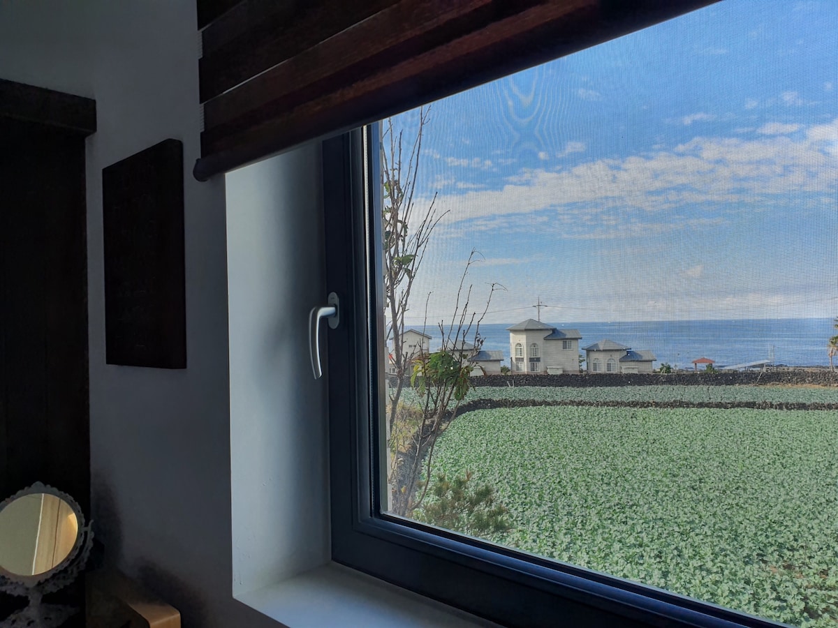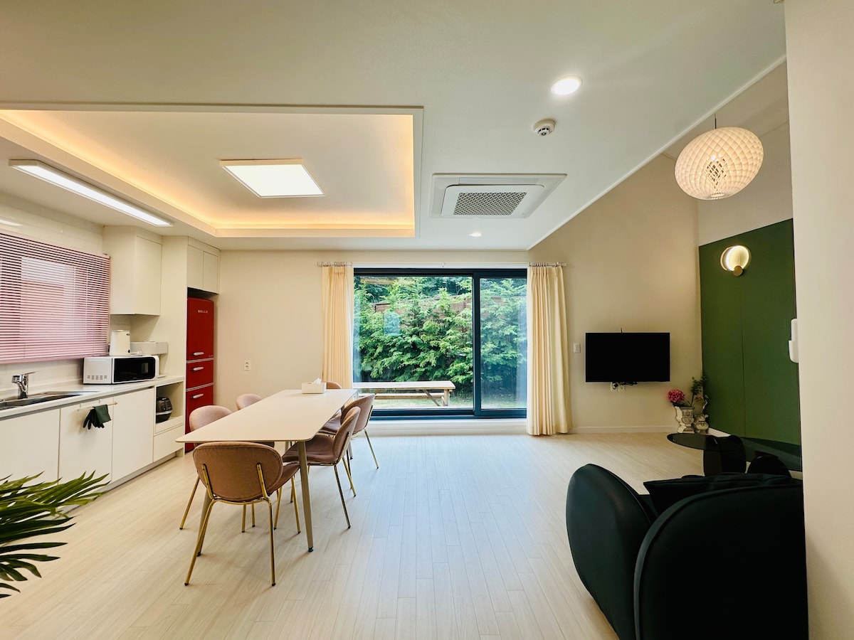 Collaboration of nature and modernity of Jeju. No hidden camera guaranteed. You can try the detector installed in the house. - up to 6 guests - duplex with one livingroom - 2 bedrooms: one with bed, one Korean Ondol - 1 bathroom - front yard - 35 min from the Airport - 3 min from Kimnyung Sea - 5 min from Maze Land - 10 min from HamDuk Sea - 10 min from WolJungRi Sea - 15 min to Pyeongdae-ri - 15 min to Bijarim Forest - 15 min to Sehwa Beach - 25 min to Seongsan Sunrise Peak