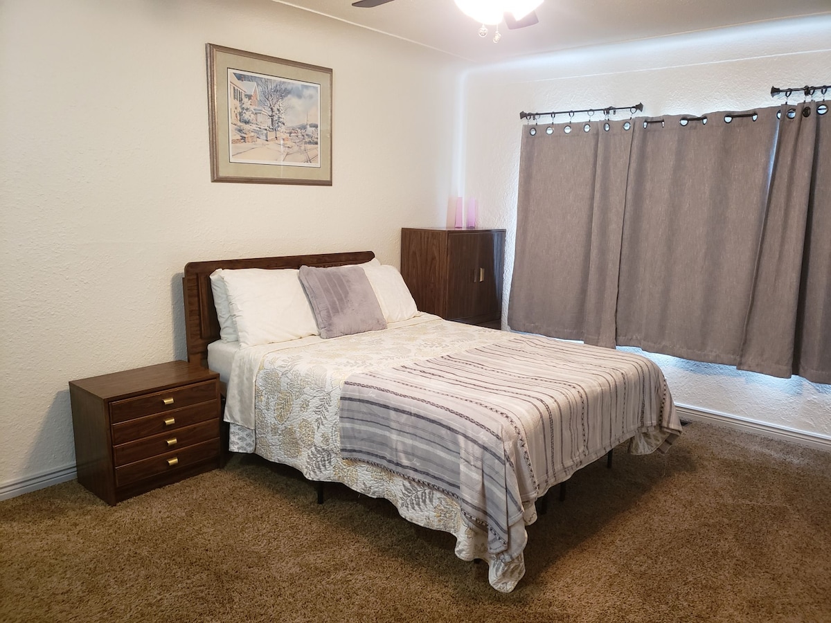 Spacious two bedroom, 1 bath basement apartment with full kitchen (stove, fridge/freezer, microwave, toaster, utensils, silverware, etc. The living room has a nice free-standing gas fireplace, which makes the apartment very cozy. There is also a TV with an Amazon Firestick, allowing guests access to Netflix, Hulu, YouTube, etc. Each bedroom has a comfortable queen sized bed, dresser, and electric fireplace for added comfort and ambiance.