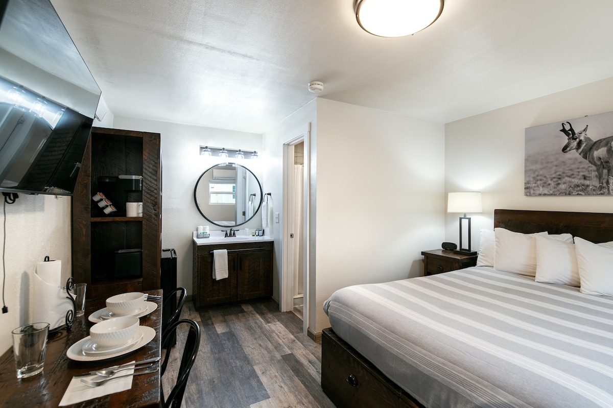 Our newly renovated, residential style One Bedroom King Suites located in downtown Jackson are the perfect choice for your next adventure. Our suites feature a master bedroom with king bed and bathroom, living room with queen sized sofa sleeper and fireplace, a second bathroom, kitchen and private balcony or patio. Sleeps up to four people. We take care of all your cleaning during your stay and after departure. Just leave your keys in your suite and we will take care of the rest.