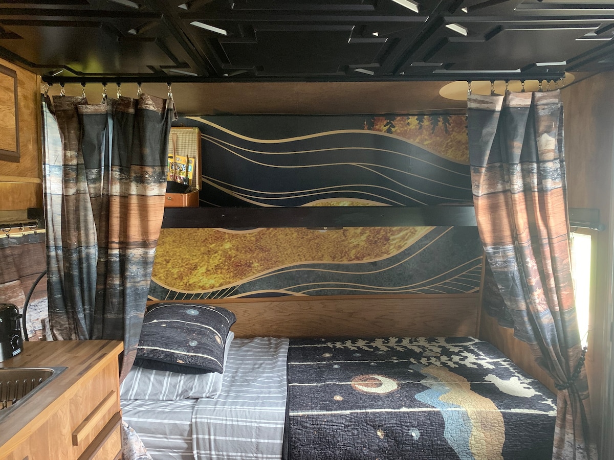 *Location is in an open field with business traffic and noise from I-90. Please don’t book if that is an issue for you.* Just 7 minutes from the airport and a short drive to ski hills, our modern camper is perfectly situated for adventure and relaxation. Enjoy a cozy escape with a plush queen bed. For additional sleeping arrangements, we have a kitchen dinette that converts into a small bed (suitable for two small children or one small adult) and a single mattress for the floor.