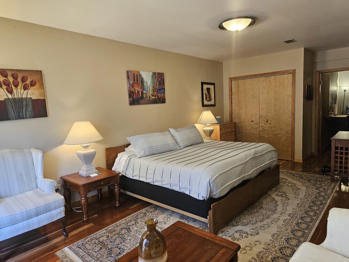 Seasoned and experienced superhosts host this charming private suite with a private entrance. It has one bedroom with a king size bed. The house is on a very quiet street. You may not even know you're in the middle of town. You may see deer and other animals roaming around the neighborhood. The space includes private bathroom, kitchenette, and a sitting area with a loveseat and a small dining area.