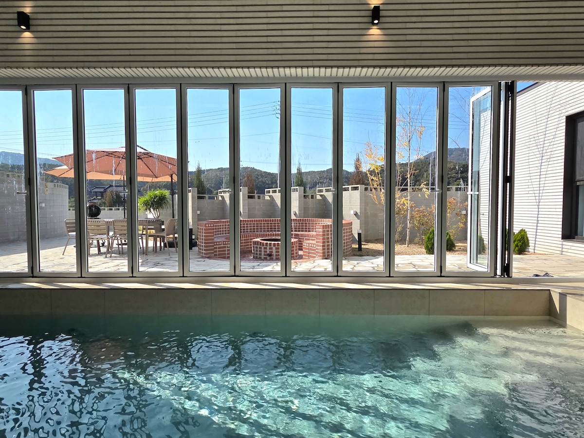 ☞ 단 한팀만 예약받는 독채풀빌라펜션 펜션지기가 거주하면서 직접 세심하게 관리 운영하는 펜션입니다. *톡hueruem *폰 5299-2913 ※ 관리동이 있어 언제든 머무르는 동안 게스트 불편없는서비스제공 ※ 고급 오가닉 순면 침구, 타올, 친환경세제로 직접 세탁한 침구 매일 교체. ※ 온수풀무료유지 자동필터, 직접청소로 청결 유지 ※ 친환경 (오가닉) 욕실용품(바디워시, 샴퓨, 트리트먼트) ※ 추가 침구 제공 ※ 세탁서비스 ◈ 넓은 실내수영장, 침실3(퀸침대2, 싱글침대2), 화장실2, 주방, 거실, 넓은 바베큐데크(몽골텐트), 8인용식탁 다이닝 룸, 티비,소파룸 거실, 테라스 ▶ 정수기, 의류탈수기, 티비(넷플릭스무료), 냉장고, 시스템에어컨, 도킹스피커, 미니오븐, 전기밥솥, 전자렌지, 전기포트, 네스프레소캡슐커피, 식기조리도구 ▶기본양념, 타올, 세면도구, 헤어드리이어, 샴푸, 트리트먼트, 바디핸드워시, 튜브 물놀이용품, 놀이감 등