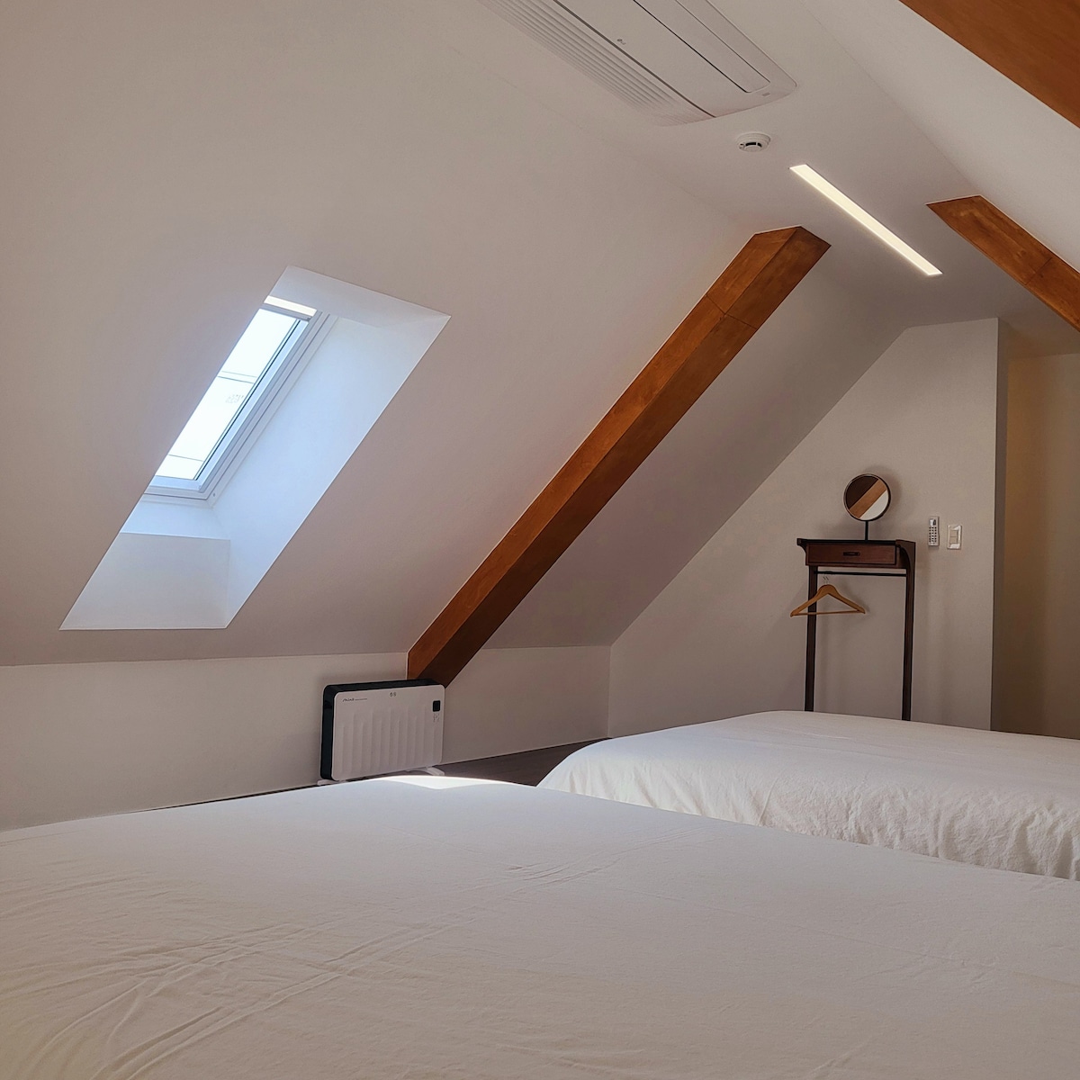 stay윤슬은 눈큰새우하우스3층에 있으며 조천의 작은 바닷가 마을앞에 있습니다. 아담하고 미니멀한 분위기에 조용히 힐링하고 싶은 분들께 추천합니다. 1층은 카페및1인게스트하우스로 이용되며 stay윤슬은 3층 전체 독채로 이용되고 있습니다. 3층 출입문은 별도로 있습니다. 넓은 마을 공용주차장과 바다가 바로 앞에 있어 도보로 걸어가시면 등대가보이는 부둣가 바다가 나옵니다. 함덕해수욕장은 차로 5분 거리에 있습니다. 3층루프탑에서 바라보는 붉은노을과 바다풍경은 제주여행의 또다른 힐링과즐거움을 드릴 것입니다. *이벤트중 : 2박이상 연박시 와인서비스