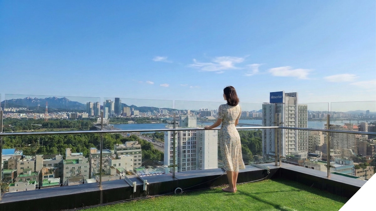 This high-ceiling residence offers panoramic views of the Han River and Bukhansan from about 48 meters above ground. Convenience store on the 1st floor. Guests staying 3 nights or more receive one complimentary rooftop experience with Han River views: -> Private use for you / 3 hours once => You can enjoy korean delivery food here(We can help you) (For reservations made after March 15, 2026.) Reservation with the host is required. Rooftop access is limited to reserved times.