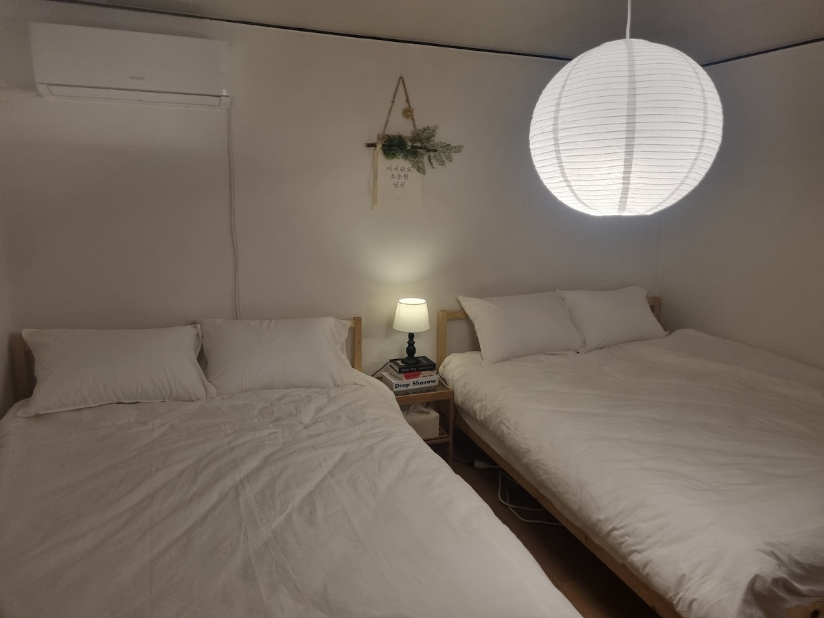 🎉이벤트-20%할인/1명무료/1인1침대서비스🎉 ❤️여러명이 머물기에 적합한 넓은 숙소 ✅객실면적 26평,거실1+방3+욕실1(단독주택1층,마당,퀸침대5개) 🤭주요 관광지 모두 도보가능 -팔달문2분 -공방맛집3분 -팔달시장4분 -통닭거리7분 -화성행궁8분 -수원시립미술관 11분 -수원화성박물관 15분 😘저희 숙소는 바로 옆 예쁜 공방거리와 맛집,그리고 절이 맞닿아 있는 따뜻하고 포근한 숙소 입니다. 특히, 팔달사(절)가 붙어 있어 조그만 마당에서 고요한 종소리도 들을 수 있어 힐링이 될 수 있는 곳 입니다. 등산과 산책을 좋아하시는 분들은 바로 옆 팔달산 계단을 이용하셔서 자연을 만끽 할 수 있으며, 편의점,맛집,영화관,통닭거리, 남문/지동/팔달/영동시장,화성행궁 등 모두 도보로 이용 가능한 위치에 있습니다. ☺️방3개,퀸침대5개가 있어 최대10명까지 묵을 수 있어, 우정,가족여행에 적합한 숙소입니다. 오픈서비스로 추가비용없이 1인1침대사용