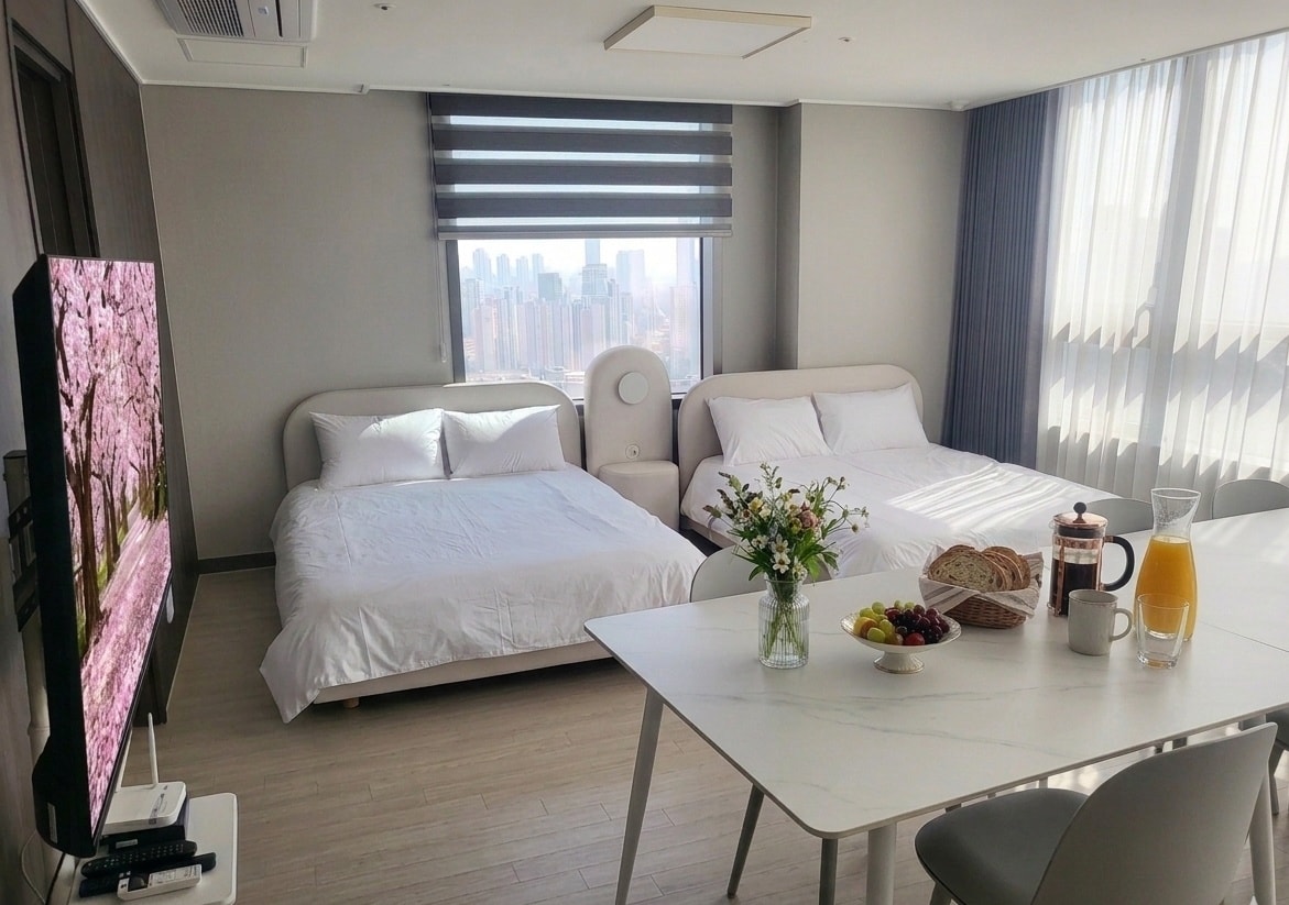 - 세련된 인테리어와 넉넉한 공간을 갖춘 대형 룸 숙소로, 가족·친구와 함께 특별한 시간을 보내기에 적합합니다. - 거실의 통유리창 너머로 송도의 도심 전경이 시원하게 펼쳐지며, 퀸사이즈 침대 3개와 소파베드 2개, 호텔급 침구와 욕조를 갖추어 편안한 휴식을 제공합니다. - 거실 통유리창 너머로 송도 락페스티벌 공연장을 내려다볼 수 있는 프라이빗 VIP 뷰 객실입니다. - 주방에는 다양한 조리도구와 식기류가 완비되어 있어 가족 여행객은 물론 장기 숙박에도 편리합니다. - 송도국제도시 중심부에 위치해 지하철, 쇼핑몰, 카페거리, 심해수 온천 등 주요 편의시설 접근성이 뛰어나며, 조용하고 안전한 주거 환경 속에서 여유롭고 품격 있는 시간을 즐기실 수 있습니다.주요 편의시설 접근성이 뛰어나며, 조용하고 안전한 주거 환경 속에서 품격 있는 시간을 보내실 수 있습니다.