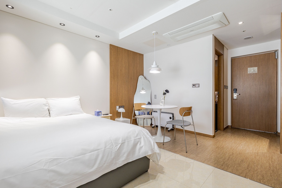 서울에서 가까운 인천 서해 바다의 너른 풍경, 빠듯한 일상 속 잠시 쉼이 필요할 때 짐도 마음도 가볍게 놀러오세요 :) 늘 깨끗하게 관리하고 있습니다. 바다와 초록 공원이 내려다보이는 테라스, 통유리창으로 바라보는 시원한 통창 오션뷰, 쾌적한 레지던스 대형 복층 원룸 감성 숙소 ▪️인천공항 자동차 15-20분 ▪️인스파이어 아레나, 파라다이스, 을왕리 해수욕장 등 주요 관광지 자동차 25-30분 ▪️구읍뱃터 선착장 2km 자동차 5-7분 ▪️ 상가 중심 지구 위치, 도보 5분 이내 식당, 카페. 건물 1층 편의점 ▪️넷플릭스 ▪️기준 2인-최대 4인 (2인 초과 시, 추가 비용 있음) ▪️이용시간 - 체크인 : 오후 4시 - 체크아웃 : 오전 11시 *얼리체크인/레이트체크아웃은 추가 비용 및 스케줄 조율이 필요하니 사전문의 부탁드립니다. ▪️반려동물 동반 불가 ▪️실내 흡연 절대 금지 ▪️주차(1대 무료) - 건물 B1~B4 /주차장-숙소 연결 (2대 이상 추가 비용)
