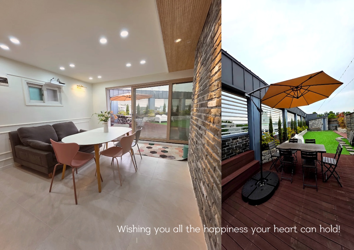 新房源市中心度假村风格私人50坪屋顶花园/35坪,4间客房/2间浴室,10人/弘大30分钟/全套设施/#美门