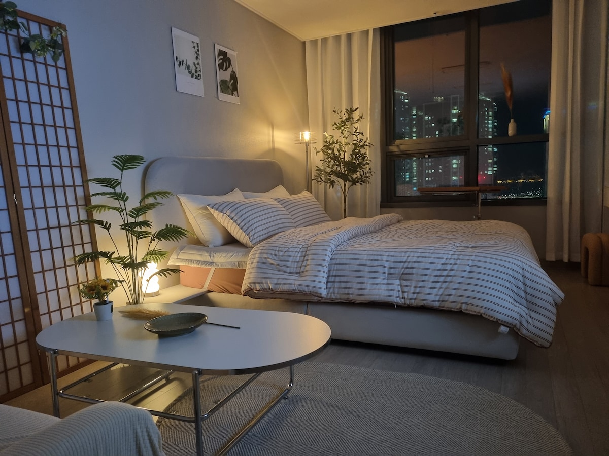 [Provide direct English communication] Just 5 mins from sub station: Songdo Moonlight Festival Park / Relax in a peaceful studio where calm design meets warmth. With a wide round table, soft lighting, and fireplace-style décor, it’s perfect to unwind. Feel the cozy atmosphere with candlelight and thoughtful touches. An extra floor topper and bedding can be provided for ₩20,000. A convenience store, café, restaurants and bar are all in the same building for your comfort.