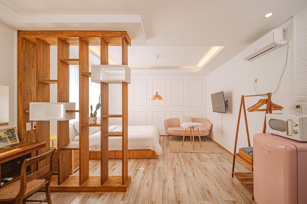 " 한림속하루" 입니다. "모들"에 관심을 주셔서 감사합니다. ; ) * 흑백사진 이벤트를 진행중입니다. 궁금하신 사항은 문의주세요.^^ 한림속하루에는 "모들"과 "다솜" 이 있어요.^^ 현관문을 열고 들어가시면 거실에는, 스튜디오풍의 조명과 TV와 쇼파가 자리 잡고 있습니다. 거실 정면의 창에는 작은 바테이블(bar table )이 있어 작은 뒷마당의 조경을 보시며 차(Tea)나 간식 등을 드실 수 있습니다. 물론 와인 한잔 하시기엔 그만이죠. 전자레인지와 포트가 준비되어있고요. 침실 공간 앞에는, 4~6인용 원목 테이블이 있습니다. 이 공간에서 하루를 메모하시며 간식 등을 드실 수도 있고요. 일정을 정리하거나 계획하실 수 있는 정도의 넓은 테이블입니다. 거실 공간은 스튜디오 풍 조명으로 편안하게 쉬실 수 있게끔 정리되어 있습니다. 침실은 커다란 퀸침대와 아기자기한 화장대가 편한한 조명 아래 자리 잡고 있습니다.