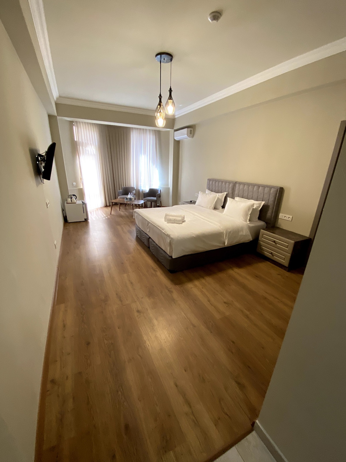 It's a clean and large room in a partially opened hotel with 100 rooms. Rooms have a climate control sistem. Stilish rooms are comfortable and clean. Thay have everithing for stay. These large room is capable for family with 3 kids (there is a baby cot for kids under 2 years) Hotel is in the quite area not far from a busy centre.