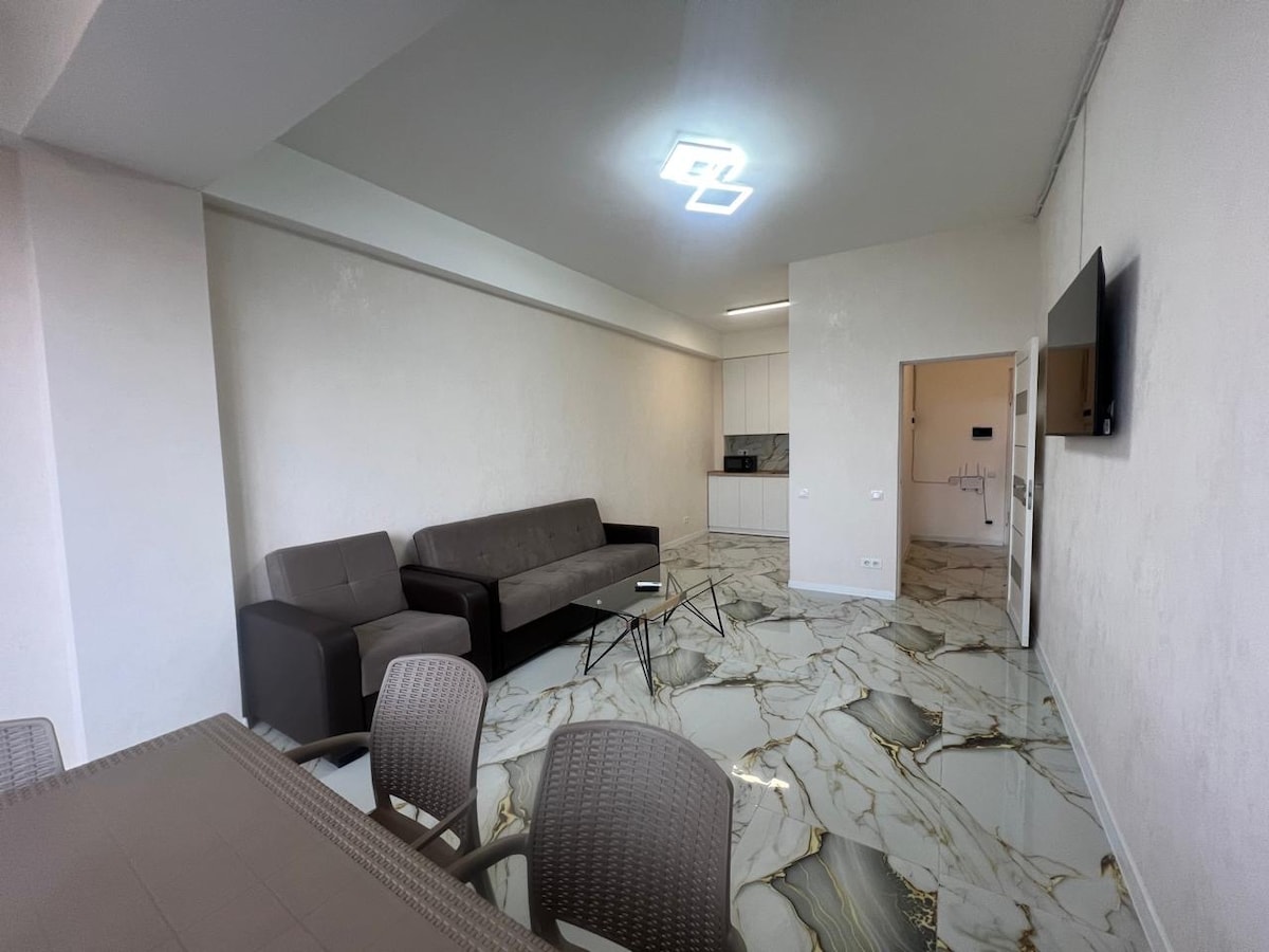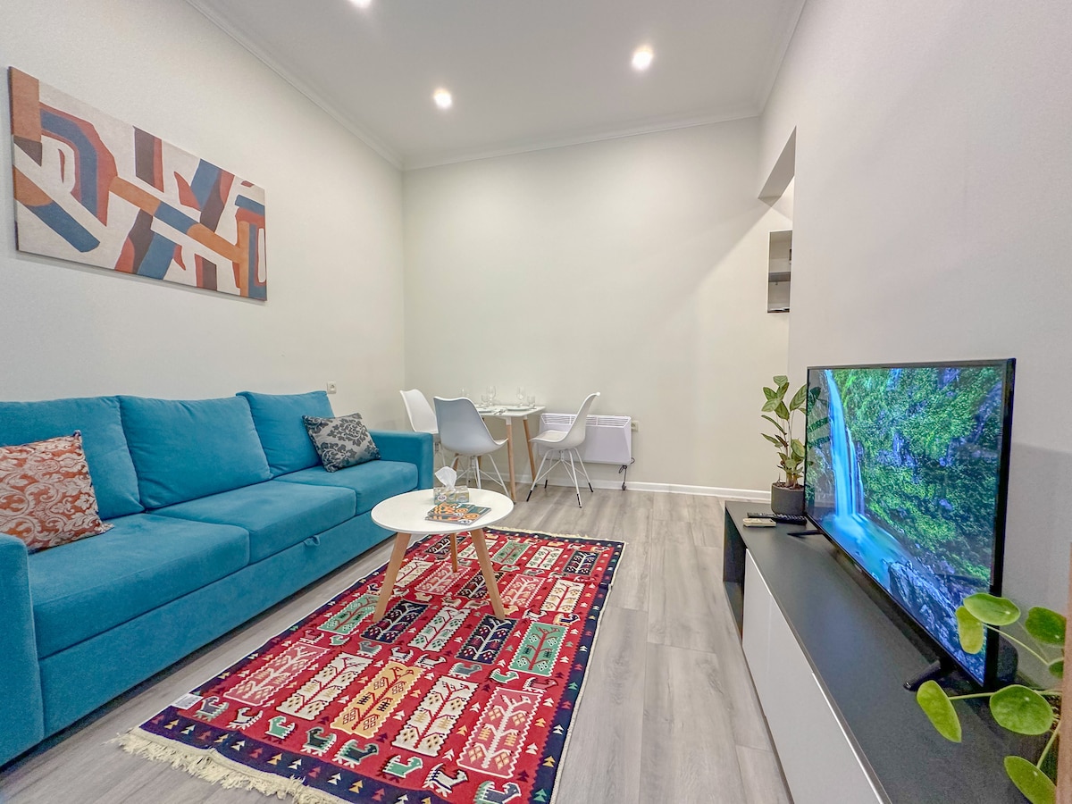 Fully renovated luxury 1-bedroom apartment with unique design, located on the 2nd floor, just a 10-minute walk from Cascade. Equipped with brand-new furniture and appliances, modern open-plan kitchen, washing machine, and comfortable bed & sofa. - 45" Smart TV, high-speed Wi-Fi, dedicated workspace. - 24/7 check-in. - 3/10 floor - Newly cosy renovation Accommodates up to 4 guests. Ideal for families, business travelers, and remote work.