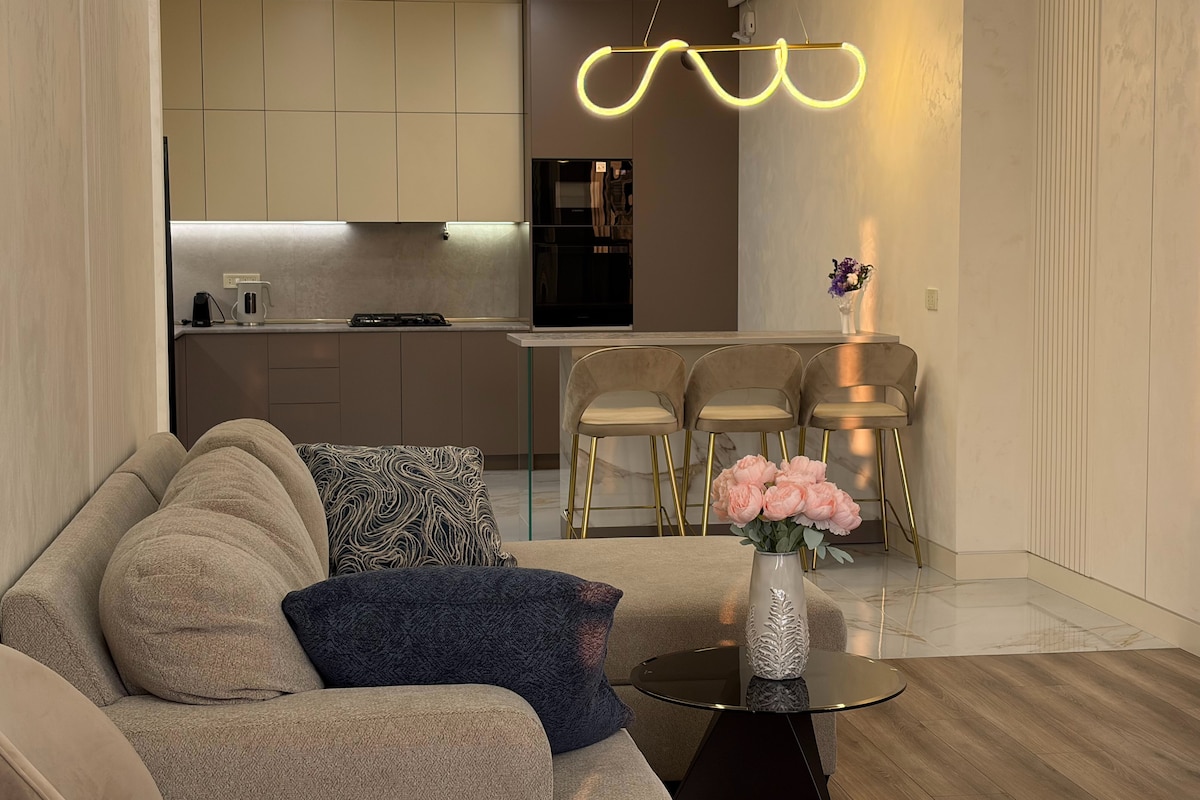 Discover our beautifully renovated apartment situated in a serene residential neighborhood. Enjoy the tranquility of the green recreation area, offering a view of the capital, the stunning Mount Aragats, and a nearby water park. The city center is just a short 4-5 km drive away. What's more, our strategic location grants you close proximity to the vibrant Megamall, a charming zoo, and heart-pounding adventures at water parks and sports complexes that will leave you thrilled.