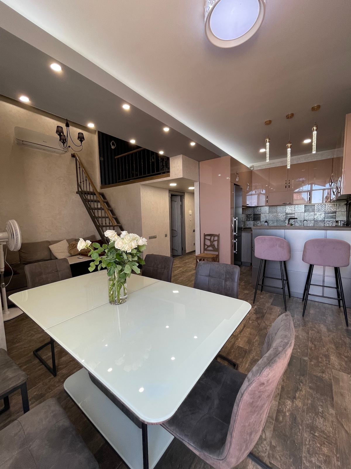 Discover our beautifully renovated apartment situated in a serene residential neighborhood. Enjoy the tranquility of the green recreation area, offering a view of the capital, the stunning Mount Aragats, and a nearby water park. The city center is just a short 4-5 km drive away. What's more, our strategic location grants you close proximity to the vibrant Megamall, a charming zoo, and heart-pounding adventures at water parks and sports complexes that will leave you thrilled.
