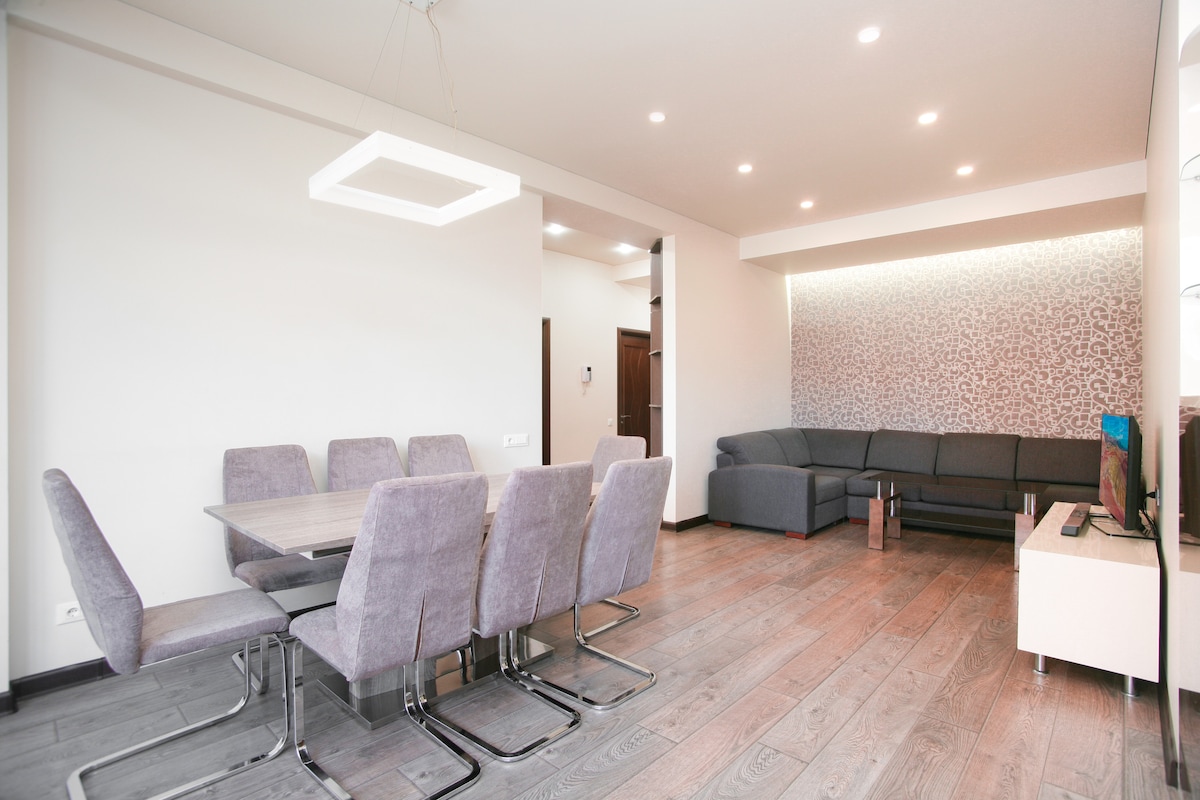 1 King size bed (180 cm wide), 2 single beds (100 cm wide) + folding sofa, 93 sq m, 12/12 floor (with elevator) new building, open balcony, coffee table, dining table for 4 persons, working table , fresh clean towels, linen, pillows, blankets, iron and hairdryer, hot water, heating system and air conditioner, fully equipped kitchen, refrigerator with freezer, washing machine, electric kettle, gas stove, oven, microwave, 3 smart TV 32” LED, cable TV, Wi-Fi. I will be glad also to offer tour activities across Armenia (like Garni, Geghard, Sevan, Dilijan, Tatev monastery, etc.), as well as car hire service. The apartment is located right next to Dalma Garden Mall and within meters of the Armenian Genocide Memorial and Museum, Yerevan Brandy Factory, and the Central Bus Station. Grand Republic Square is a 25-minute walk away. There is a bus stop just 100m away with numerous buses and micro buses to all districts of the city. Everyday cleaning included. This is a new listing. You can check the other apartments and co-host's accounts for all the reviews.