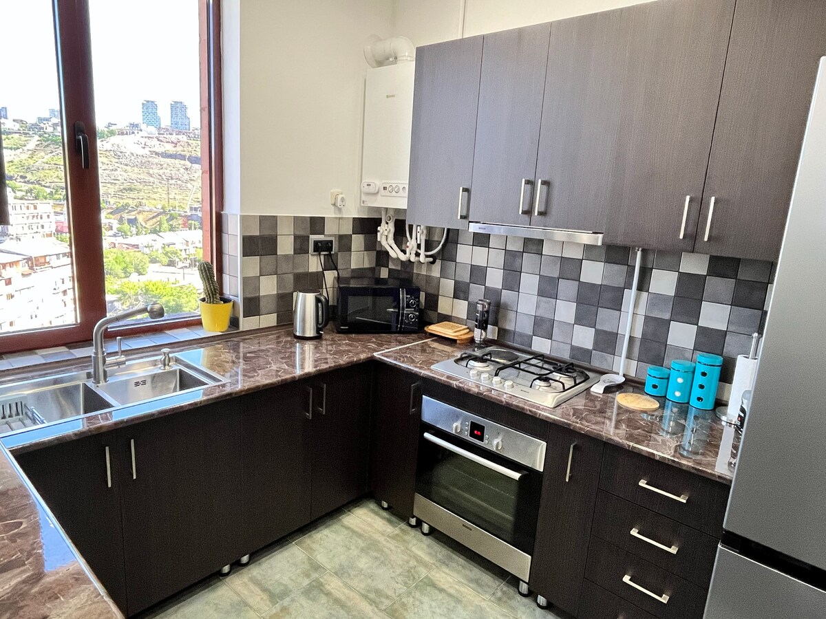 This freshly and fully renovated apartment in a modern and classy building can be yours for your stay in Yerevan. The guests will enjoy the breathtaking views of the city during their stay. Both the neighborhood and the building itself are super safe (gated and surveyed with cameras), and the Central area of the City is 15 minutes walk. The building also has an elevator and private garden where you can organize your cookouts.