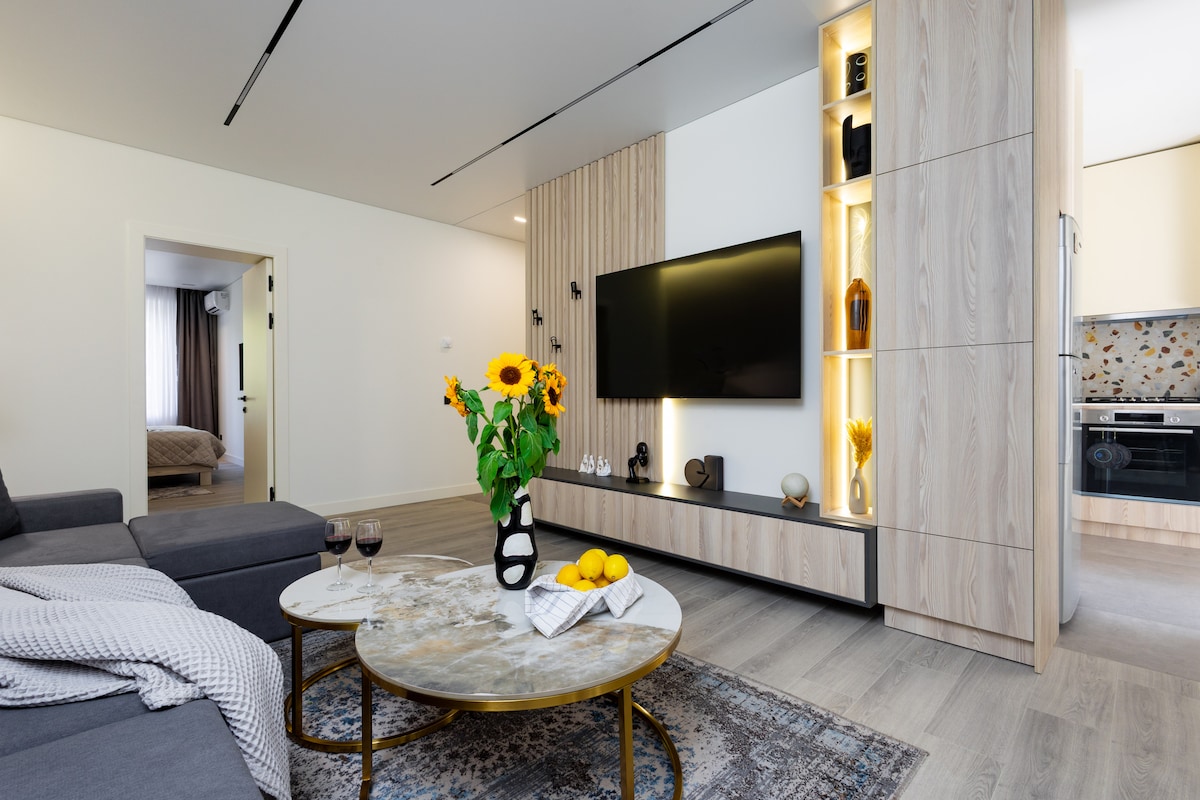 An absolute ☆☆☆☆☆ property with breathtaking view ✓ 24/7 Self Checkin/ Security ✓ Spacious 93 sqm ✓ Specious balcony w/ Insane Views ✓ 4/9 floor, ✓ Lift ✓ Brand New Building ✓ Central Heating And Cooling ✓ ACs in the bedroom and living room ☆ "This home is a must stay" ✓ Luxuriously Fitted w/ Premium Amenities ✓ Fully equipped + stocked kitchen + dishwasher ✓ WIFI ✓ Fresh Linens and towels ✓ Starter Luxury Hotel Toiletries Add my listing to your wishlist by clicking the ♥