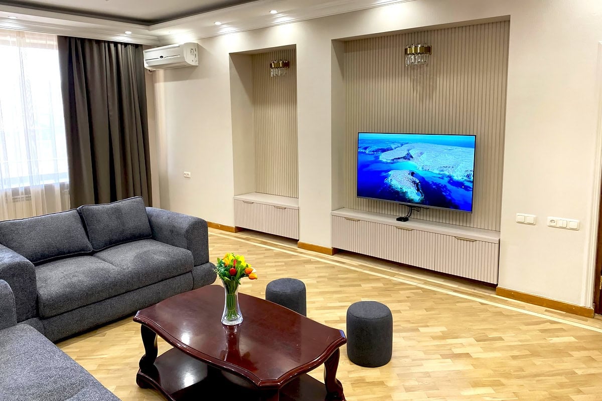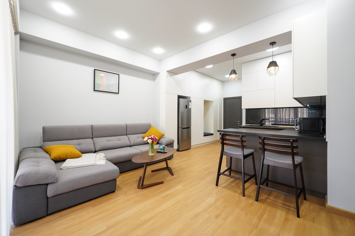 Located in the very heart of Yerevan, this light-flooded New Building unit offers most cozy stay. Feel the spirit of hospitality right upon entering: we will meet & accompany you through the rooms. The unit is fully furnished, supplied with home & kitchen appliances, including complimentary tea, coffee & bottled water upon check-in! The rental prices include charges for water, electricity, heating, Wi-Fi internet, 24/7 technical assistance as well as housekeeping service. No Hidden Costs.