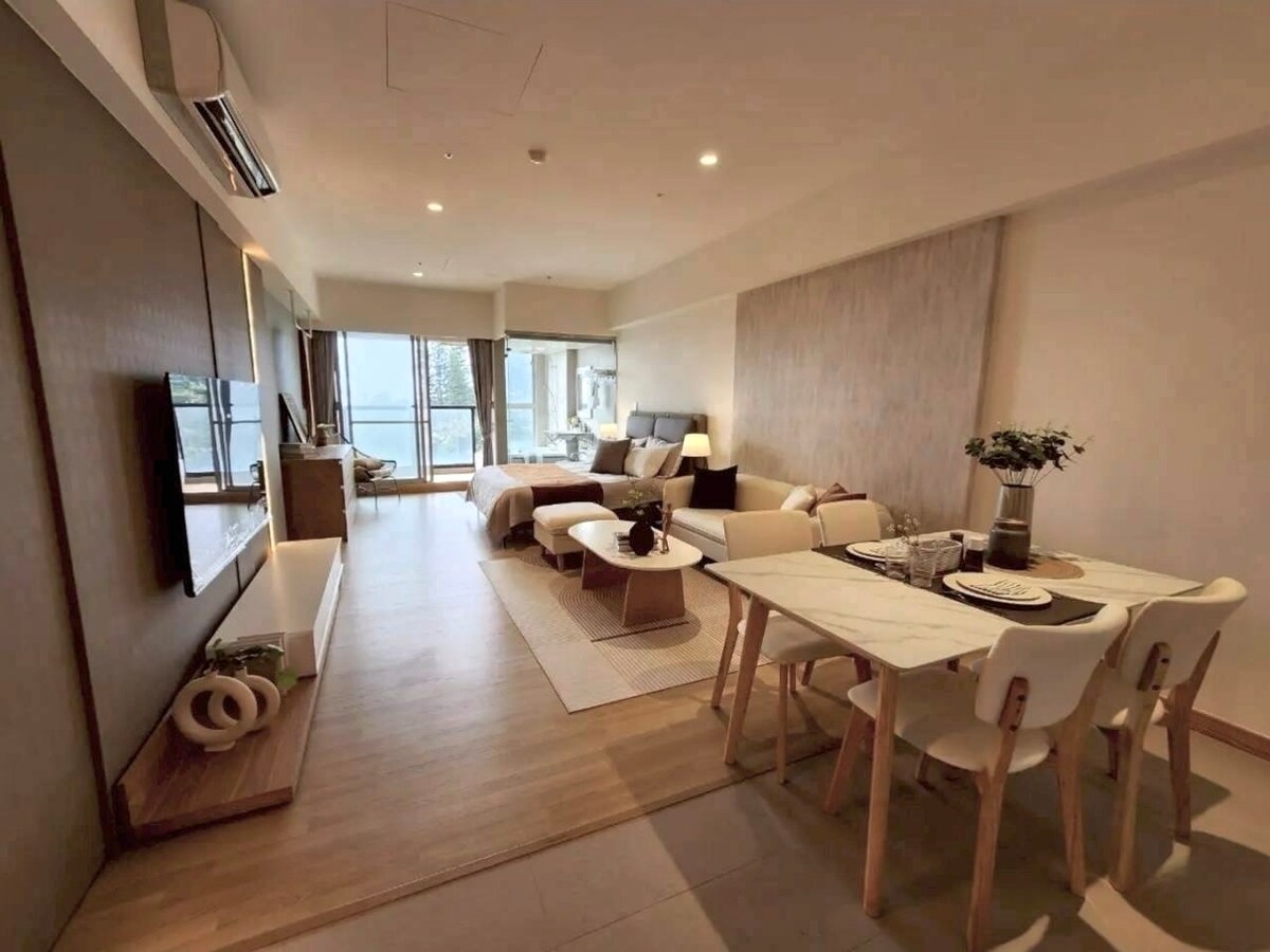 [平日回饋中]高樓海景附浴缸.巨臥榻.室內車位.泳池.單車.65吋4K電視15坪大房 .鄰海300米