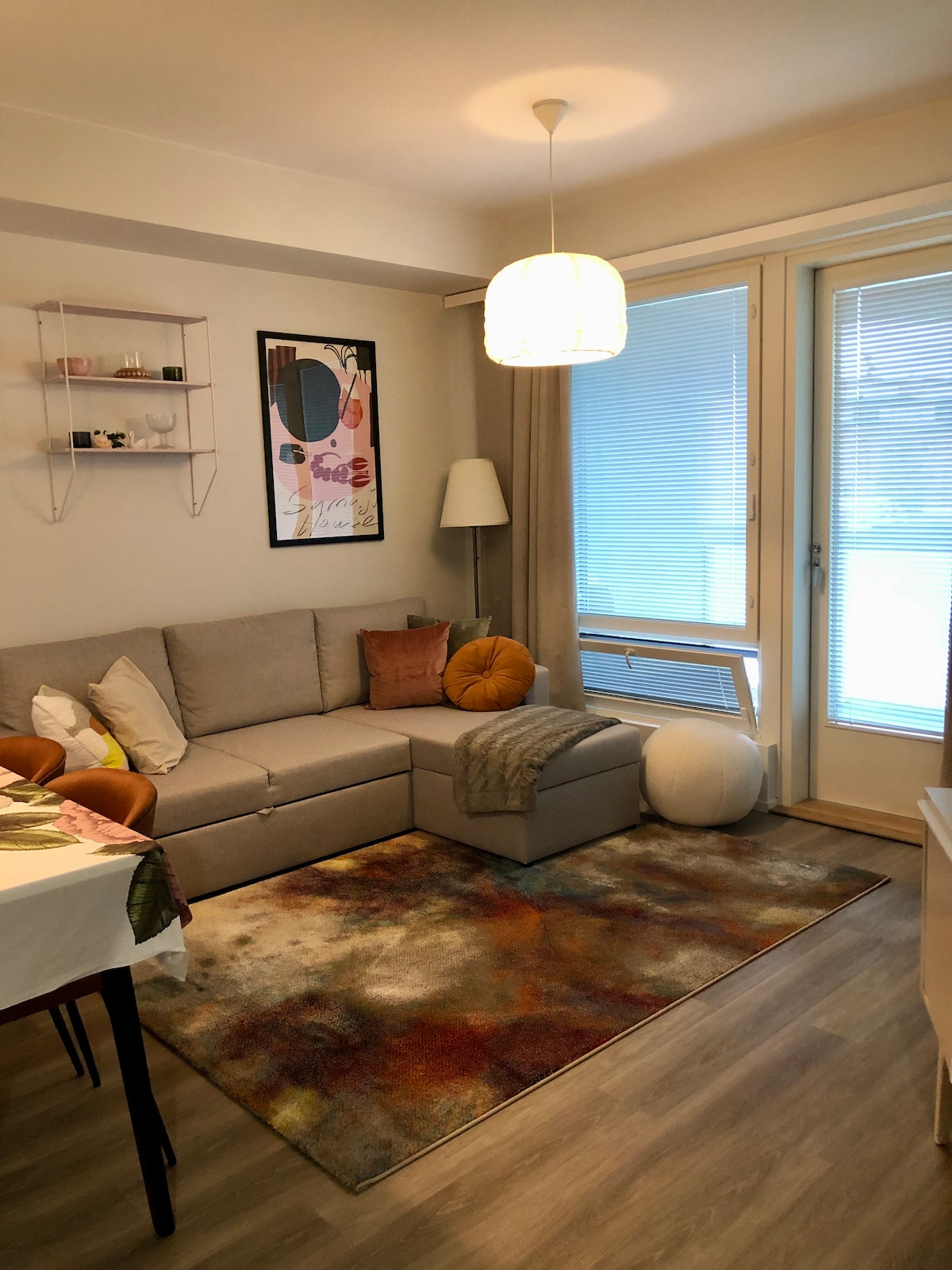 Relax in your private sauna in this fully renovated, modern apartment in the center. ★ "...clean, modern and beautifully decorated. Highly recommended!" ☞ Sauna & free parking. ☞ Fully equipped + stocked kitchen ☞ 65” Smart-TV & 500 MB wifi. ☞ Fully renovated. 》2min walk to shopping, restaurants, and arctic tours. 》3min walk to airport/Santa Claus shuttle bus. 》11min drive to Santa Claus Village and to ✈ airport 55m2 stylish home on the 1st floor –> no elevator. Book now before it’s gone!