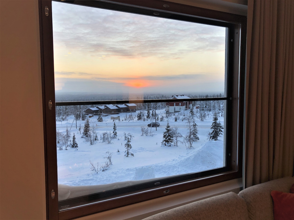 Magic of Lapland with easy access to unforgettable adventures. Top-floor (45 m²) apartment accommodating 5 guests. The apartment features a bedroom with a 160 cm wide double bed, an alcove with a 120 cm wide bed and an 80 cm upper bed, a fully equipped kitchen, sauna and a bathroom with a drying cabinet and a washing machine. Separate toilet. Gliding through snowy landscapes on a husky safari or reindeer sleigh ride. You can focus on creating memories. Bed linens and final cleaning are included.