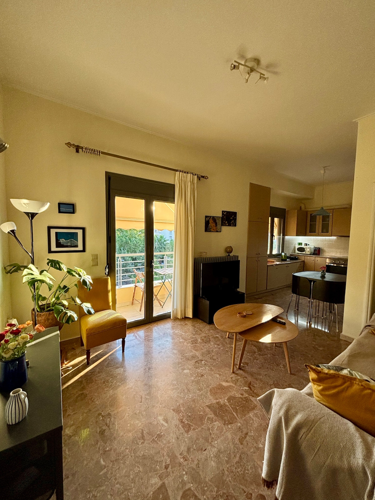 The 70m² apartment is in a sunny square with cafeterias, restaurants, tavernas, and beautiful scenery. Independent & comfortable, fully equipped, with three bedrooms, a kitchen, and a spacious bathroom. (Bedrooms 2 & 3 are connected with a door) Tourist attractions and museums are within a 2km range, and public transportation (bus, metro, trolleys, or taxis ) makes it easy to reach them.