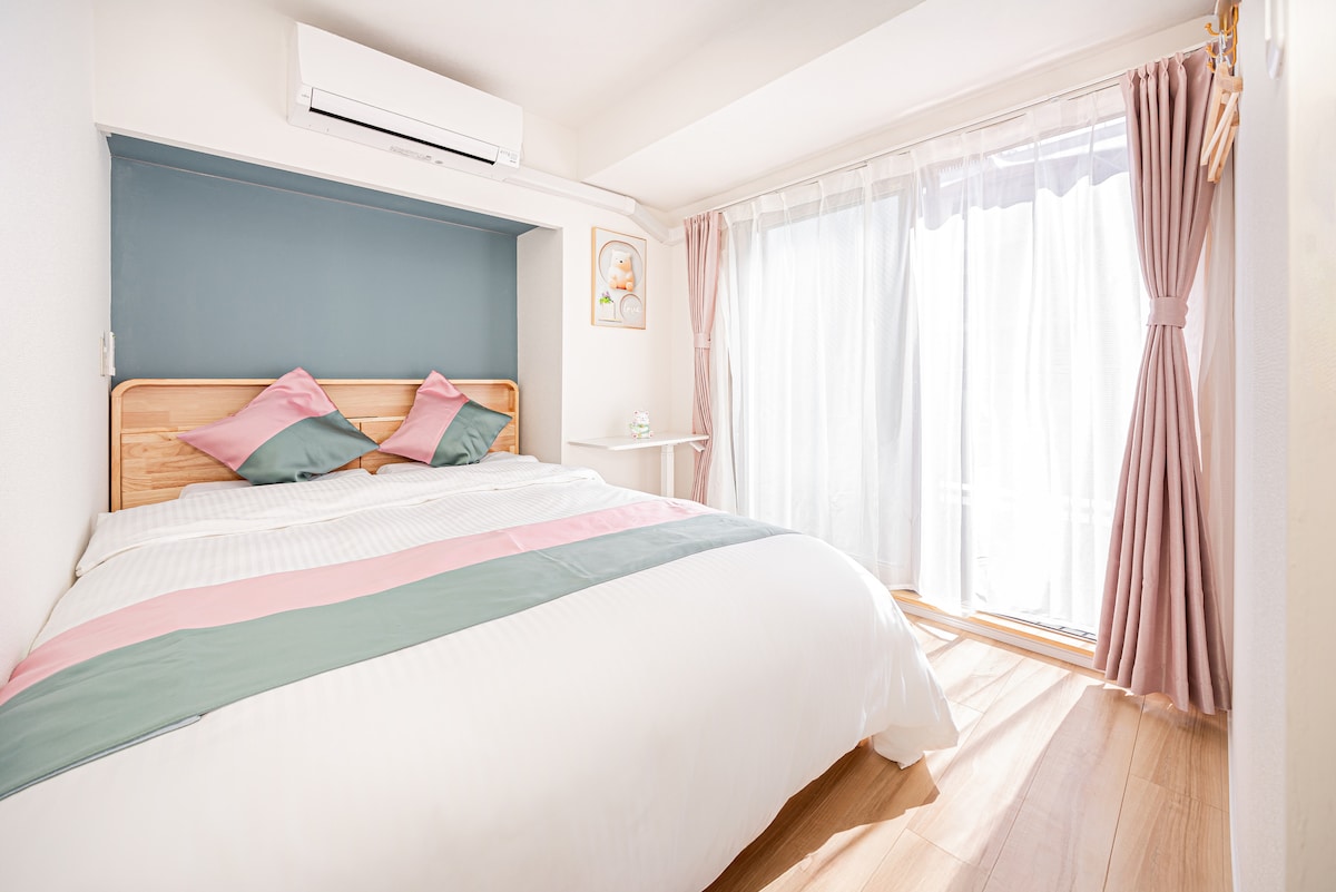 涩谷站徒步6分钟 涩谷十字路口(步行5分钟):打卡全球最繁忙十字路口,感受东京脉搏。 -步行8 分即可到达SHIBUYA SKY(涩谷Scramble Square顶楼):360度俯瞰东京全景(建议提前预约) JR涩谷站 直达 东京 上野 秋叶原 池袋 新宿 大久保 原宿 目黑 品川 成田机场 羽田机场 🛋️ 房间设施与服务 两室一厅一卫生间一间浴室( 干湿分离) 🛏️ 床铺安排 💞主卧:一张双人床 (宽150cm×长200cm)舒适容纳2人。 💞次卧:榻榻米上铺乳胶床垫 (宽150cm×长200cm)舒适容纳2 人。 💞客厅:折叠沙发床 (宽120cm×长200cm)可供第5位房客使用。 📌 提示:使用榻榻米时需被褥折叠到收纳柜里,腾出茶桌摆放 🧺 生活便利 -基础设备:免费Wi-Fi、冷暖空调、微波炉、冰箱、洗衣机、吹风机、熨斗、电视机、电热水壶。 - 免费用品:毛巾、牙刷、洗发水、护发素、沐浴露、面巾纸、卫生纸。 - 厨房用品:基础厨具、煎锅、锅具、碗碟。 🏪 周边设施 商圈内房源,吃饭购物,电车十条线路可用,交通十分便利。