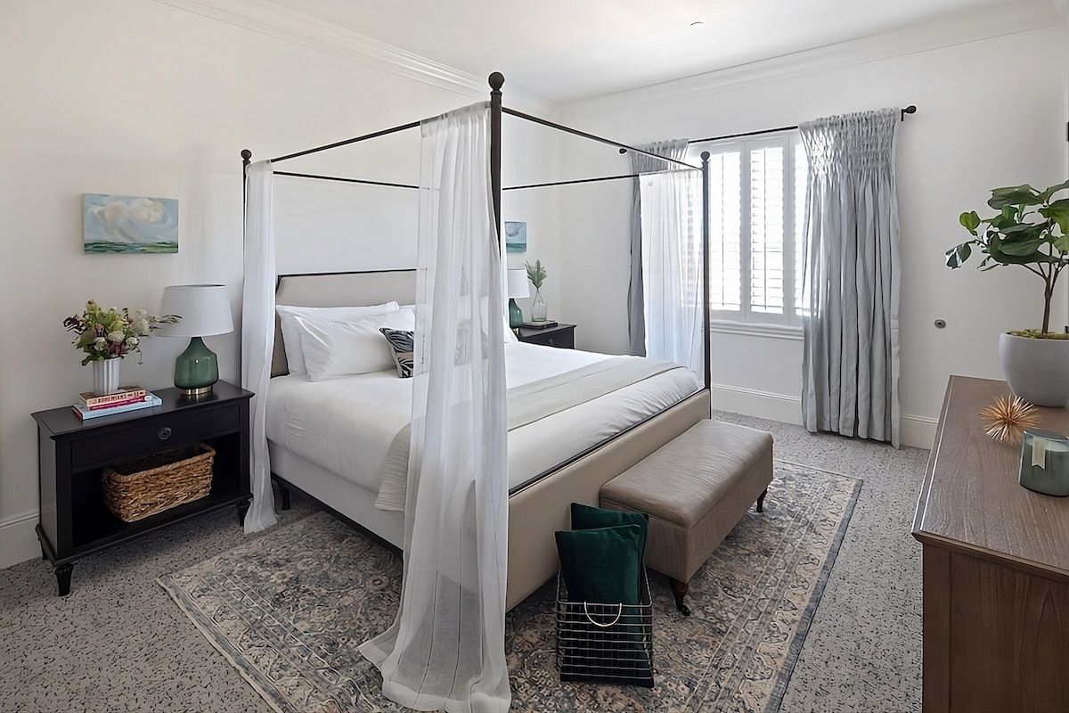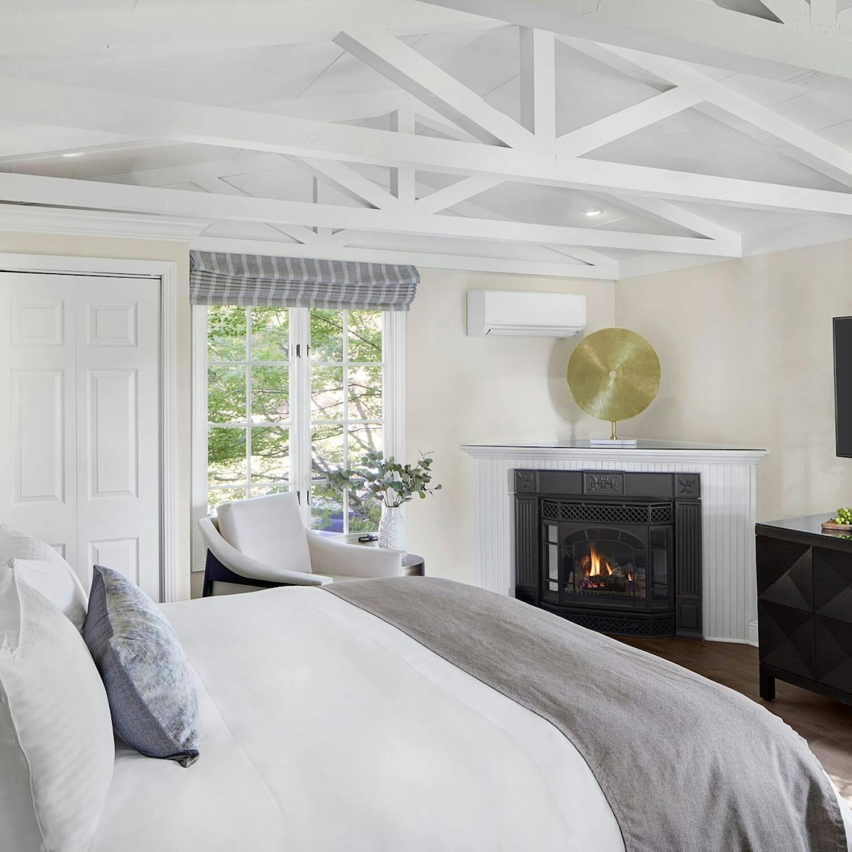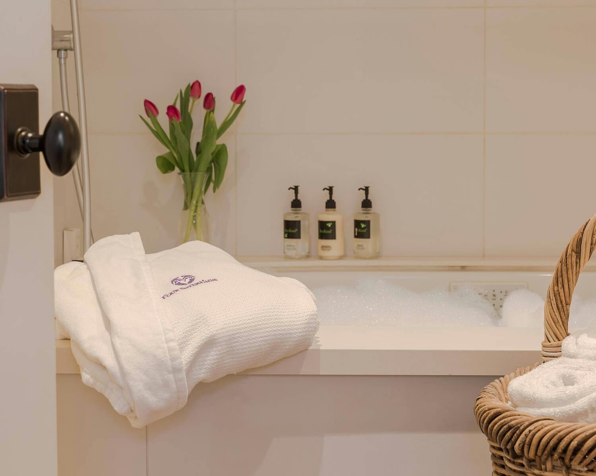 The Deluxe King Spa room at Lavender in Napa, CA offers a luxurious and cozy sanctuary featuring a plush king-size bed and elegant country décor. Indulge in your private spa tub, perfect for unwinding after a day in wine country. Modern amenities and complimentary WiFi ensure a relaxing and comfortable stay in this charming Napa retreat.