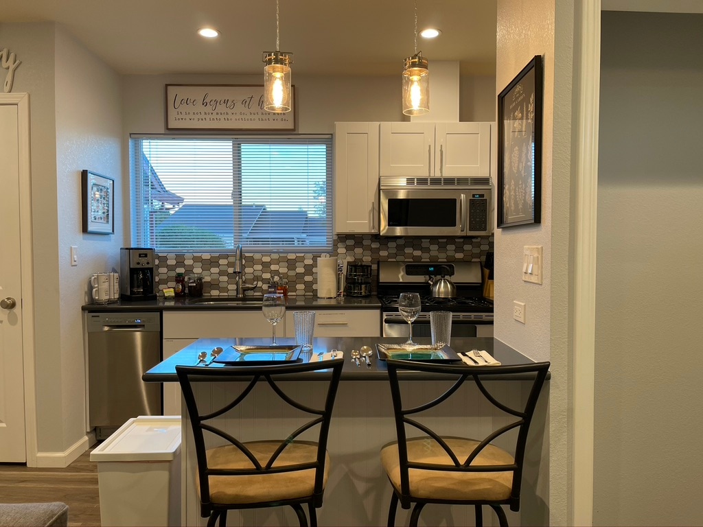 "New" (2021) construction and modern private studio located in a great neighborhood in the town of Vacaville in the East Bay Area. Private entrance and easy street parking. Full kitchen with a coffee maker, eating/desk area with bar stools, bedroom area with a KING sized bed, 1 full bathroom, washer/dryer in the unit. There is a flat screen TV in the living area and complimentary fast Wi-Fi. We have soft water too.